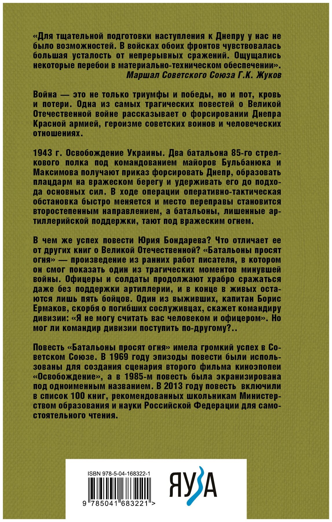 В чем же успех повести Юрия Бондарева? Что отличает ее от других книг о Великой Отечественной? «Батальоны просят огня» — одна из ранних работ писателя, в которой он смог показать один из трагических моментов минувшей войны. Офицеры и солдаты продолжают храбро сражаться даже без поддержки артиллерии, и в конце в живых остаются лишь пять бойцов. Один из выживших, капитан Борис Ермаков, скорбя о погибших сослуживцах, скажет командиру дивизии: «Я не могу считать вас человеком и офицером». Но мог ли командир дивизии поступить по-другому…