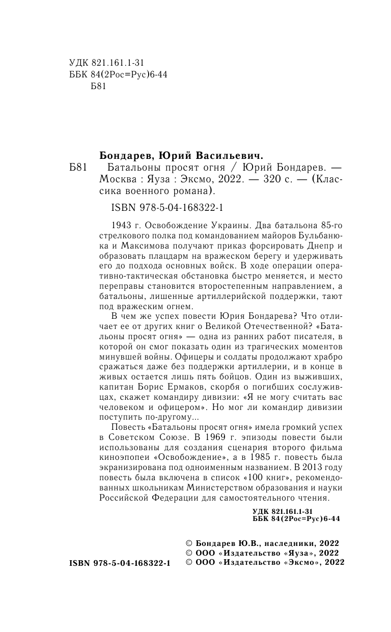 Книга: Батальоны просят огня (Бондарев Юрий Васильевич); ООО "Издательство "Эксмо", 2022