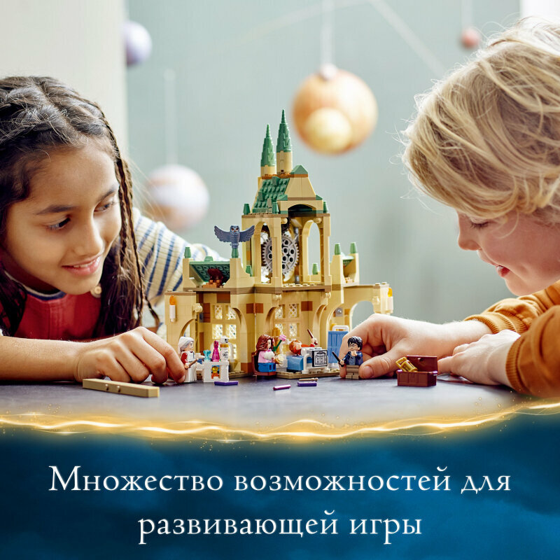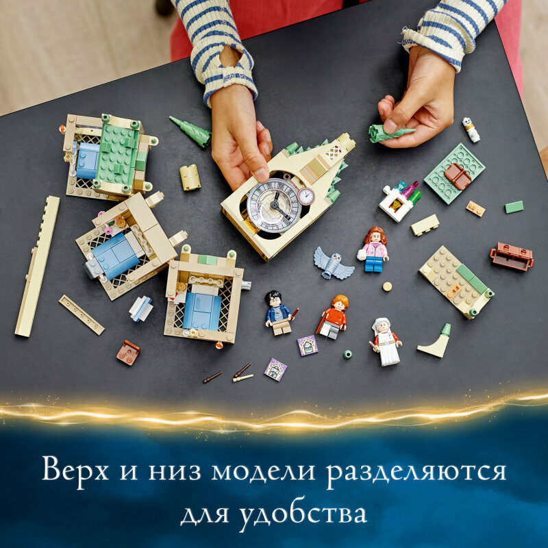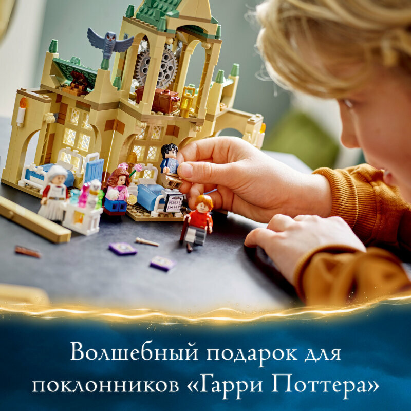 Конструктор Lego Harry Potter Больничное крыло Хогвартса 76398 развивает творческое мышление, усидчивость и мелкую моторику. Выполнен из безопасных для здоровья материалов. Набор «Больничное крыло Хогвартса» LEGO Harry Potter (76398) изобилует волшебными игровыми возможностями для детей в возрасте от 8 лет: от ролевых игр в заботу о больных в госпитале до приключений с путешествиями во времени в часовой башне. Идеально подходит для поклонников Гарри Поттера Юные колдуньи и волшебники присоединяются к Гарри Поттеру, Рону Уизли и Гермионе Грейнджер в этом универсальном игровом наборе, основанном на памятной сцене из фильма «Гарри Поттер и узник Азкабана». В больничном крыле Хогвартса есть три кровати, ширма и мадам Поппи Помфри, которая везет свою тележку с зельями и конфетами. Рон лежит в кровати с перевязанной ногой, и ему можно выдать бутылочку с отвратительным «Костеростом». Тем временем в часовой башне Гарри и Гермиона используют маховик времени. Дети могут крутить башню, чтобы заставить стрелки часов вращаться и отправиться в прошлое для очередного волшебного приключения. Верхняя и нижняя половины набора отсоединяются, чтобы между ними можно было установить другие модули. Объединив этот набор с другими модулями из серии, можно создать целый замок Хогвартс