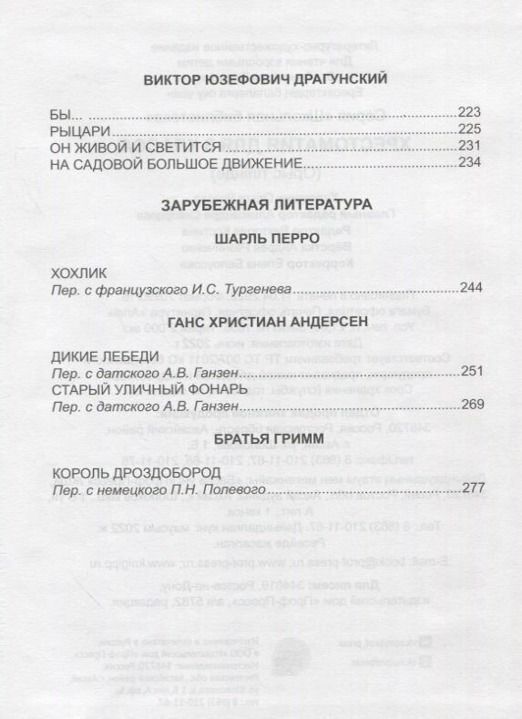 | Автор(ы) | Пантелеев Леонид; Чехов Антон Павлович; Куприн Александр Иванович; Одоевский Владимир Фёдорович; Бажов Павел Петрович; Платонов Андрей Платонович; Драгунский Виктор Юзефович; Андерсен Ганс Христиан; Перро Шарль; Братья Гримм |