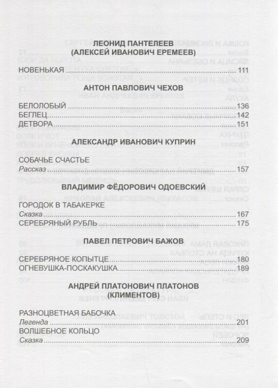 | Автор | Пантелеев Леонид; Чехов Антон Павлович; Куприн Александр Иванович; Одоевский Владимир Фёдорович; Бажов Павел Петрович; Платонов Андрей Платонович; Драгунский Виктор Юзефович; Андерсен Ганс Христиан; Перро Шарль; Братья Гримм |