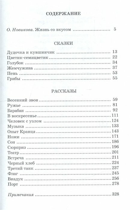 В сборник вошли сказки "Цветик-семицветик", "Дудочка и кувшинчик", "Голубок", "Жемчужина", "Пень", "Грибы" и рассказы "Весенний звон", "Барабан", "Человек с узлом", "Сон", "Черный хлеб", "Флаг" и другие