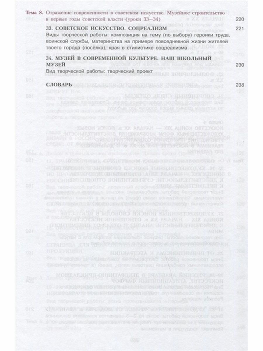 Учебник "Изобразительное искусство" для 8 класса знакомит с выдающимися произведениями архитектуры и скульптуры, монументально-декоративного искусства России и Западной Европы. Он рассказывает также о поиске новых художественных форм изображения действительности в живописи конца XIX - начала XX в., русском авангарде в декоративно-прикладном искусстве России, об утверждении принципов социалистического реализма в советском искусстве 1930-х гг. и дальнейшем его развитии, о становлении художественной афиши и рекламного плаката, о принципах художественного проектирования среды на примере транспортных средств, интерьера, мебели и одежды, о месте музея в современной культуре.