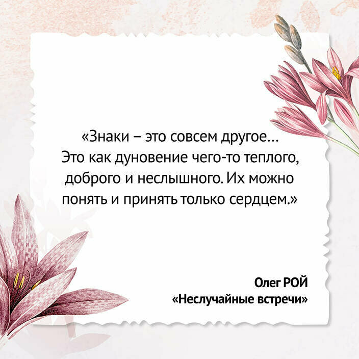 Шикарный роман Олега Роя " Неслучайные встречи"!!Очень трогательная история любви, местами даже хотелось плакать. Все герои разные, но, в них не возможно не влюбитсяТема судьбы, тема поколений , тема семьи, неожиданные повороты сюжетов.Читала, словно фильм смотрела!! Я настроена на продолжение новой истории!!