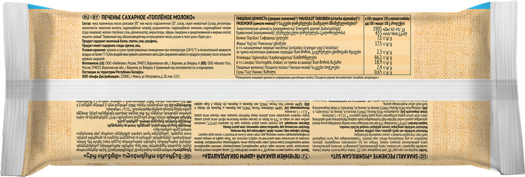| Состав | Мука пшеничная, масло растительное, сахар, сироп инвертный [сахар, регуляторы кислотности: молочная кислота, гидрокарбонат натрия], разрыхлители: гидрокарбонат аммония, гидрокарбонат натрия (сода пищевая); молоко топлёное, соль, ароматизатор, эмульгатор |