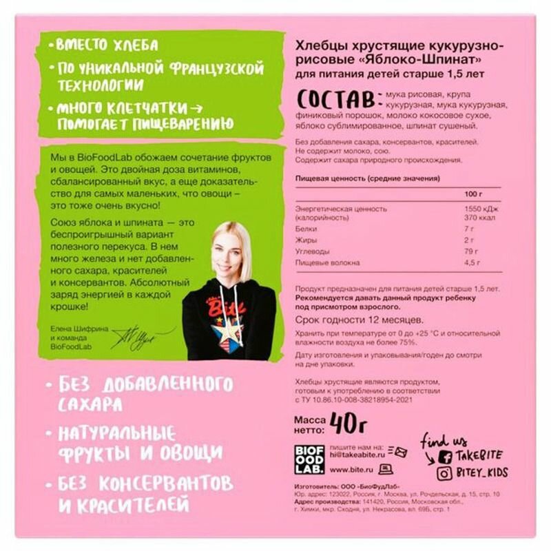 Сервис сравнения цен СкидкаГИД предлагает сравнить цены на товар «Хлебцы Bitey кукурузно-рисовые яблоко шпинат 40г»