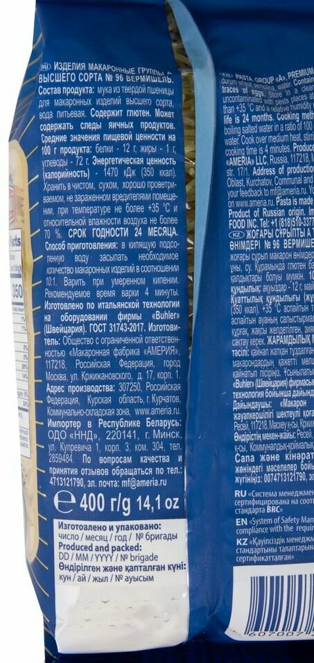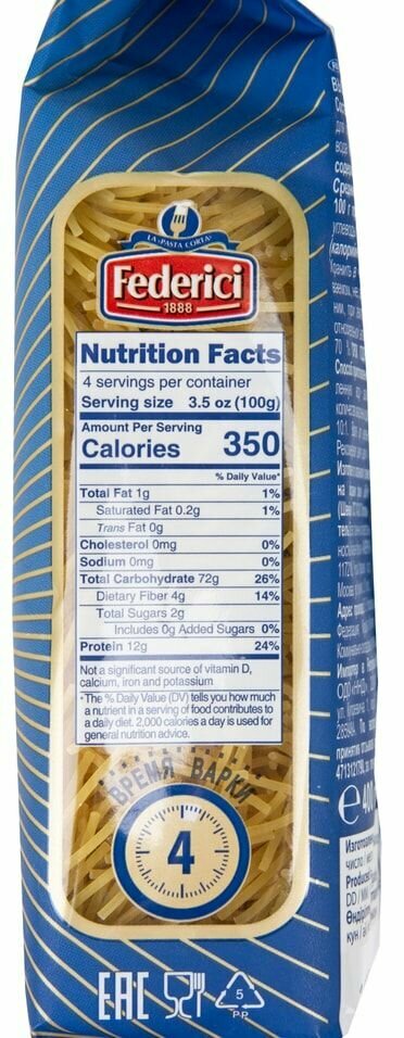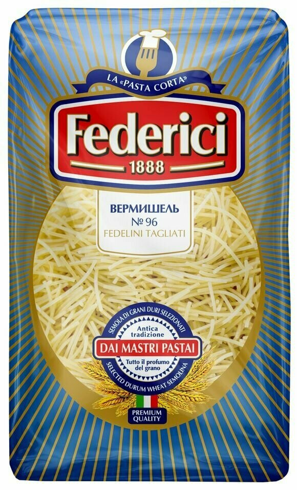 Fedelini Tagliati (Вермишель) от итальянского vermicelli — «червячки». Этот вид пасты в форме тонких коротких нитей очень быстр в приготовлении, однако, превосходно держит форму в готовых блюдах, прекрасно подходит для детского питания, а также для супов и бульонов, делая их более насыщенными.Federici №96 Fedelini Tagliati (Вермишель) производится из твердых сортов пшеницы группы «А» по классической итальянской технологии. Бренд Federici начинает свою историю c 1888 года в Италии. С 1990-х г. производство перевезено в Россию на макаронную фабрику «Америя», оснащенную современным швейцарским и итальянским оборудованием.