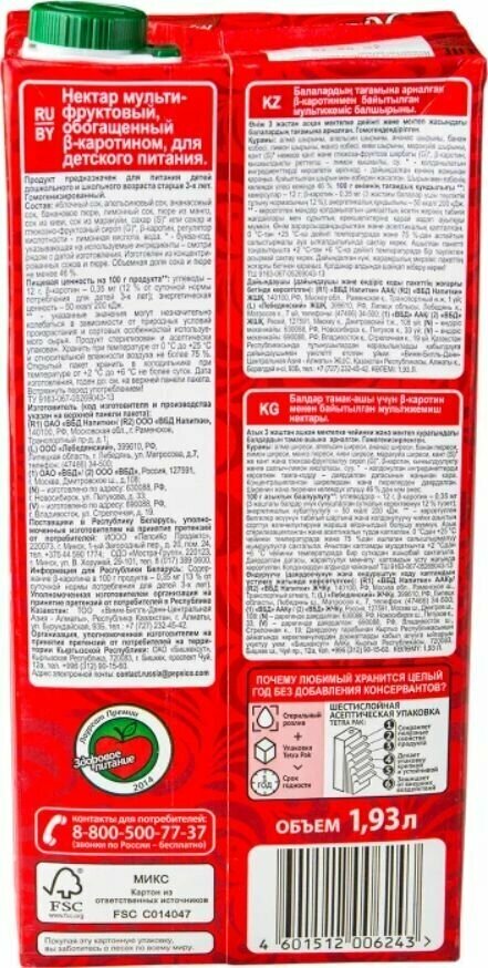 Нектар мультифруктовый с мякотью для детского питания. Гомогенизированный. Продукт стерилизован и асептически упакован. Рекомендуется для питания детей дошкольного и школьного возраста (старше3-х лет). Перед употреблением взбалтывать. Объемная доля сока и пюре не менее 50%.