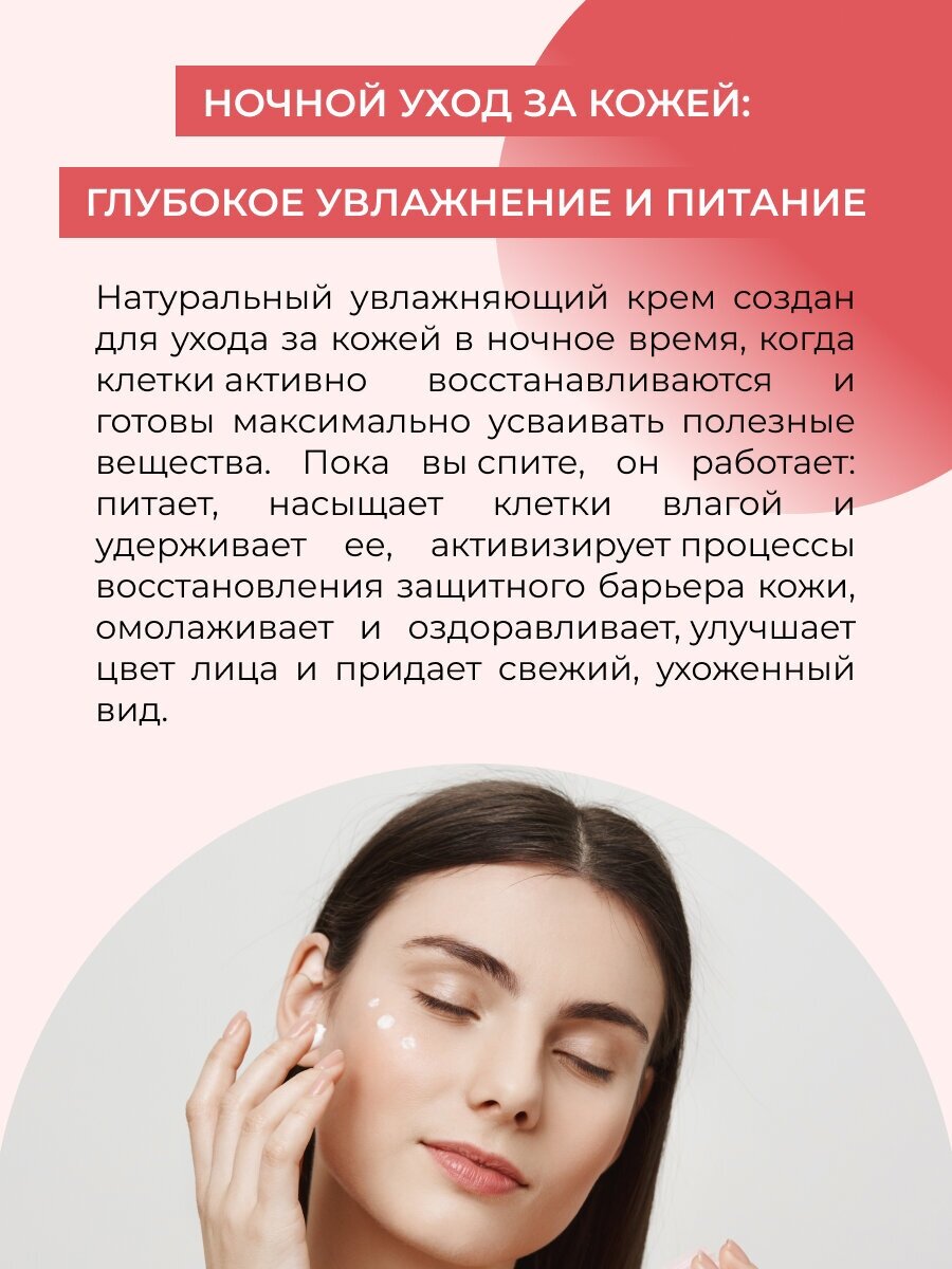 Натуральный ночной крем для лица активизирует процессы регенерации и восстановления защитного барьера кожи, удерживает влагу в клетках, поддерживая оптимальный уровень увлажнения.