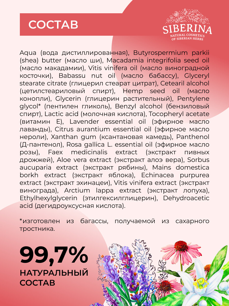 Состав: вода дистиллированная (aqua), масло ши (вutyrospermium parkii (shea) butter), масло макадамии (macadamia integrifolia seed оil), масло виноградной косточки (vitis vinifera oil), масло бабассу (babassu nut oil), глицерил стеарат цитрат (glyceryl stearate citrate), цетилстеариловый спирт (cetearil alcohol), масло конопли (hemp seed oil), глицерин растительный (glycerin), пентилен гликоль* (pentylene glycol), бензиловый спирт (benzyl alcohol), этилгексилглицерин (ethylhexylglycerin), молочная кислота (lactic acid), витамин е (tocopherol), эфирное масло лаванды (lavender essential oil), эфирное масло нероли (citrus aurantium essential oil), ксантановая камедь (xanthan gum), д-пантенол (panthenol), эфирное масло розы (rosa gallica l. essential oil), экстракт пивных дрожжей (faex medicinalis extract), экстракт алоэ-вера (aloe vera extract), экстракт рябины (sorbus aucuparia extract), экстракт яблока (mains domestica borkh extract), экстракт эхинацеи (echinacea purpurea extract), экстракт винограда (vitis vinifera extract), экстракт лопуха (arctium lappa extract), дегидроуксусная кислота (dehydroacetic acid)