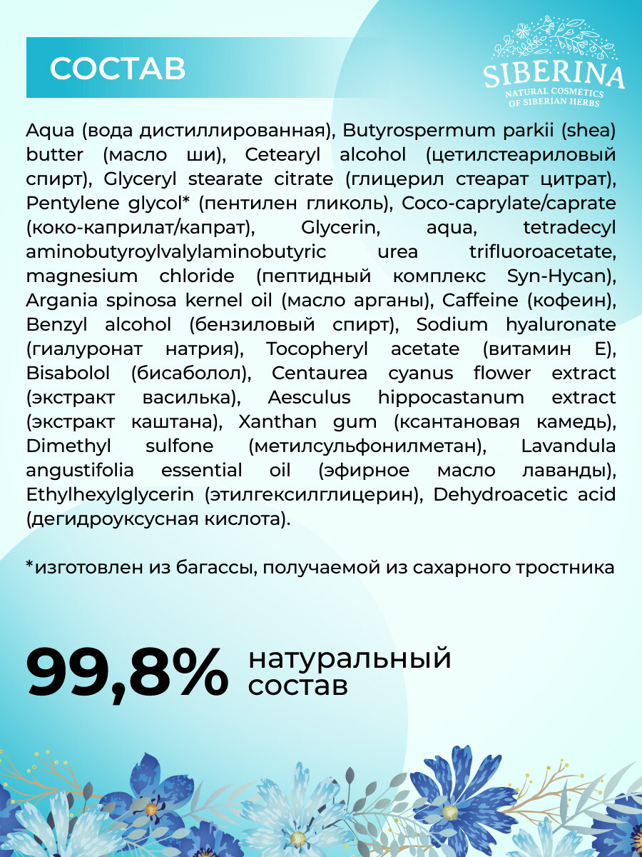 Состав: вода дистиллированная (aqua), масло ши (butyrospermum parkii (shea) butter), цетилстеариловый спирт (cetearyl alcohol), глицерил стеарат цитрат (glyceryl stearate citrate), пентилен гликоль* (pentylene glycol), изоамил лаурат (isoamyl laurate), изоамил кокоат (isoamyl cocoate), пептидный комплекс syn-hycan (glycerin, aqua, tetradecyl aminobutyroylvalylaminobutyric urea trifluoroacetate, magnesium chloride), масло арганы (argania spinosa kernel oil), кофеин (caffeine), бензиловый спирт (benzyl alcohol), гиалуронат натрия (sodium hyaluronate), витамин е (tocopherol), бисаболол (bisabolol), экстракт василька (centaurea cyanus flower extract), экстракт каштана (aesculus hippocastanum extract), ксантановая камедь (xanthan gum), метилсульфонилметан (dimethyl sulfone), эфирное масло лаванды (lavandula angustifolia essential oil), этилгексилглицерин (ethylhexylglycerin), дегидроуксусная кислота (dehydroacetic acid)