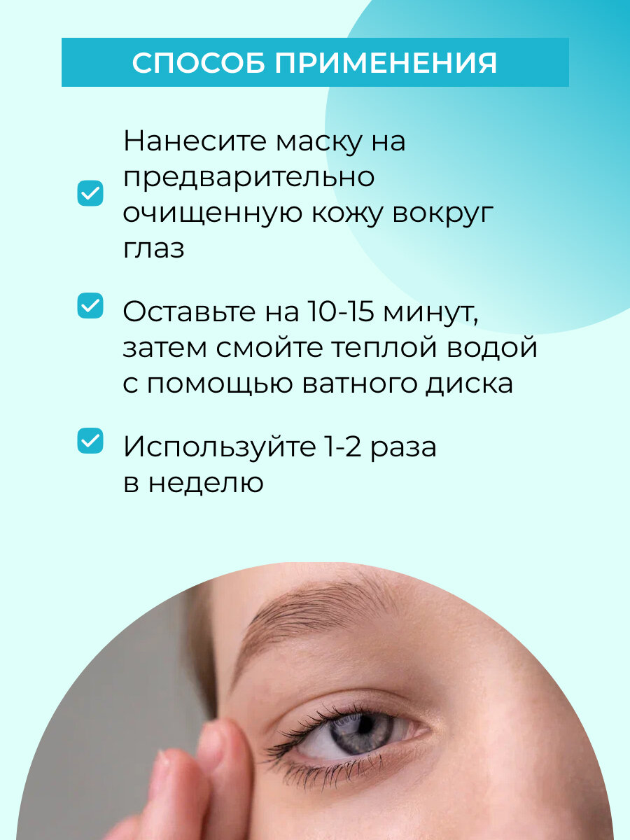 Натуральная антивозрастная маска для кожи вокруг глаз с гиалуроновой кислотой и пептидами эффективно убирает последствия обезвоженности - тонкие морщинки, сухость, шелушение и защищает от старения. При регулярном применении маска заметно преображает кожу: "стирает" синяки и темные круги под глазами, возвращая гладкость, эластичность и свежий, здоровый вид.