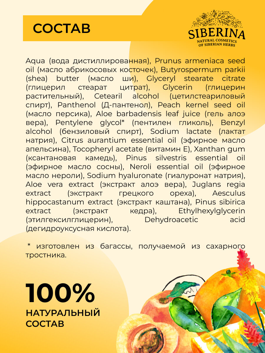 Состав: вода дистиллированная (aqua), масло абрикосовых косточек (prunus armeniaca seed oil), масло ши (butyrospermum parkii (shea) butter), глицерил стеарат цитрат (glyceryl stearate citrate), глицерин (glycerin), цетилстеариловый спирт (cetearil alcohol), д-пантенол (panthenol), масло персика (peach kernel seed oil), гель алоэ-вера (aloe barbadensis leaf juice), пентилен гликоль (pentylene glycol), бензиловый спирт (benzyl alcohol), этилгексилглицерин (ethylhexylglycerin), лактат натрия (sodium lactate), эфирное масло апельсина (citrus aurantium essential oil), витамин е (tocopherol), ксантановая камедь (xanthan gum), эфирное масло сосны (pinus silvestris essential oil), эфирное масло петитгрейна (citrus aurantium amara essential oil), гиалуроновая кислота (sodium hyaluronate), экстракт грецкого ореха (juglans regia extract), экстракт каштана (aesculus hippocastanum extract), экстракт кедра (pinus sibirica extract), экстракт огурца (cucumis sativus extract), дегидроуксусная кислота (dehydroacetic acid)