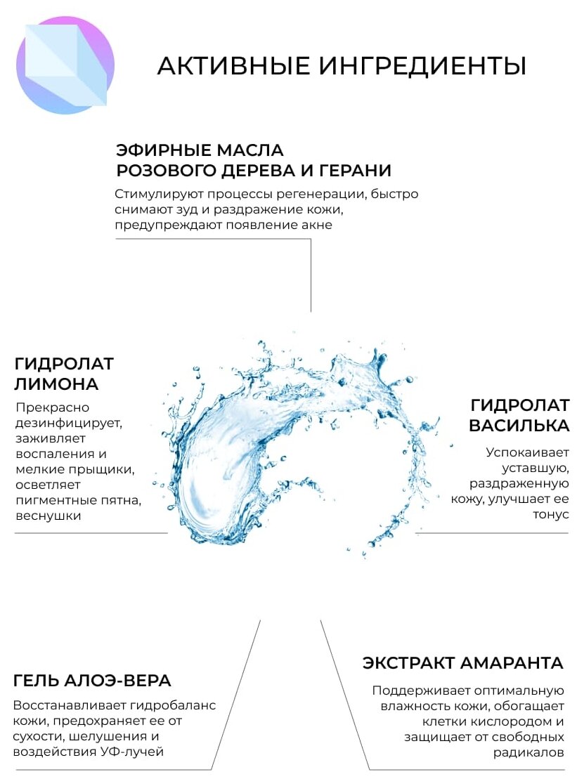| Состав | вода дистиллированная (Aqua), гидролат лимона (Citrus limon fruit water), гидролат василька (Centaurea cyanus L. flower water), полиглицерил-10 лаурат* (Polyglyceryl-10 laurate), глицерин растительный (Glycerin), гель алоэ-вера (Aloe barbadensis leaf juice), бензиловый спирт (Benzyl alcohol), пентелен гликоль** (Pentelene glycol), этилгексилглицерин (Ethylhexylglycerin), эфирное масло герани (Geranium essential oil), эфирное масло розового дерева (Aniba rosaeodora essential oil), эфирное масло фенхеля (Foeniculum vulgare essential oil), экстракт алоэ-вера (Aloe vera extract), экстракт винограда (Vitis vinifera extract), экстракт лопуха (Arctium lappa extract), экстракт амаранта (Amaranthus cruentus extract). |