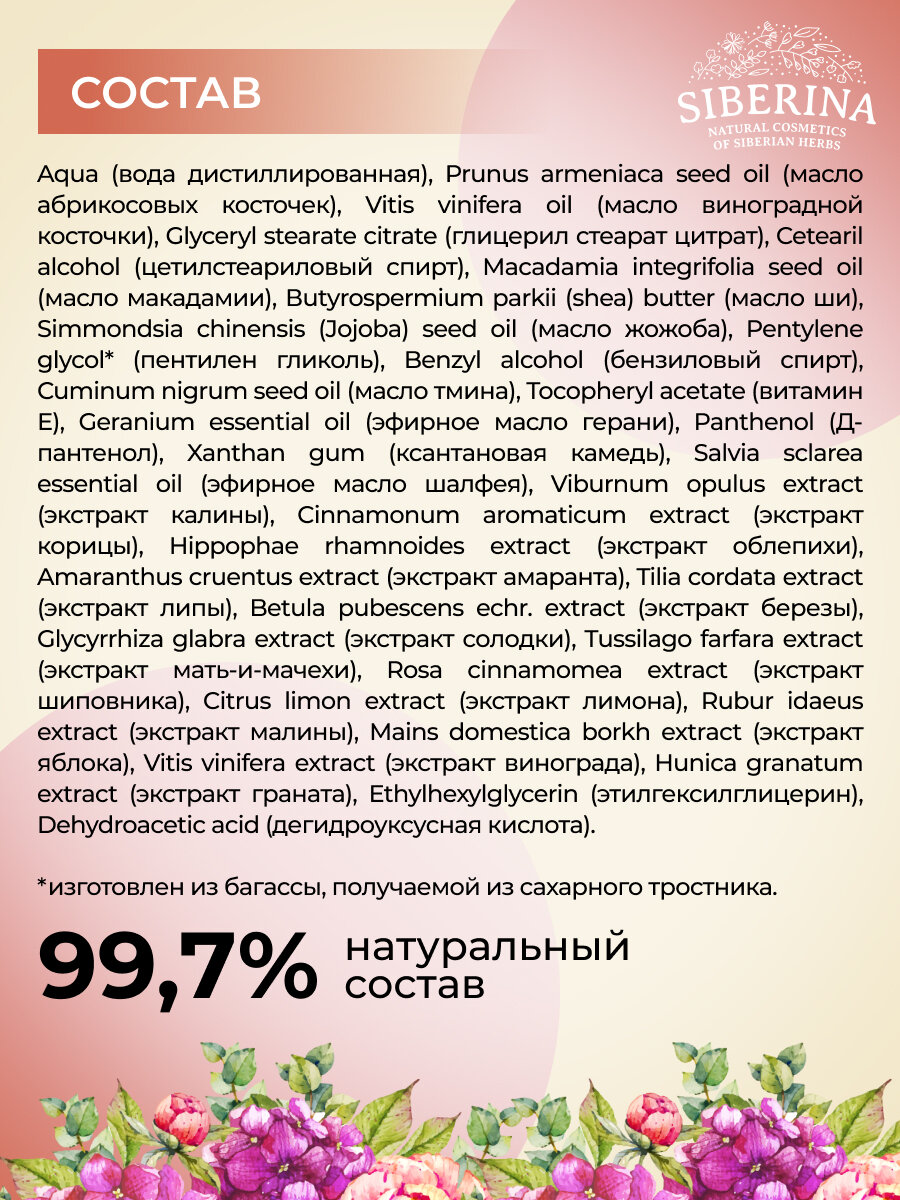 Состав: вода дистиллированная (aqua), масло абрикосовых косточек (prunus armeniaca seed oil), масло виноградной косточки (vitis vinifera oil), глицерил стеарат цитрат (glyceryl stearate citrate), цетилстеариловый спирт (cetearil alcohol), масло макадамии (macadamia integrifolia seed оil), масло ши (вutyrospermium parkii (shea) butter), масло жожоба (simmondsia chinensis (jojoba) seed oil), пентилен гликоль (pentylene glycol), бензиловый спирт (benzyl alcohol), этилгексилглицерин (ethylhexylglycerin), масло тмина (сuminum nigrum seed оil), витамин е (tocopherol), эфирное масло герани (geranium essential oil), д-пантенол (panthenol), ксантановая камедь (xanthan gum), эфирное масло шалфея (salvia sclarea essential oil), экстракт калины (viburnum opulus extract), экстракт корицы (cinnamonum aromaticum extract), экстракт облепихи (hippophae rhamnoides extract), экстракт амаранта (amaranthus cruentus extract), экстракт липы (tilia cordata extract), экстракт берёзы (betula pubescens echr. extract), экстракт солодки (glycyrrhiza glabra extract), экстракт мать-и-мачехи (tussilago farfara extract), экстракт шиповника (rosa cinnamomea extract), экстракт лимона (citrus limon extract), экстракт малины (rubur idaeus extract), экстракт яблока (mains domestica borkh extract), экстракт винограда (vitis vinifera extract), экстракт граната (hunica granatum extract), дегидроуксусная кислота (dehydroacetic acid)