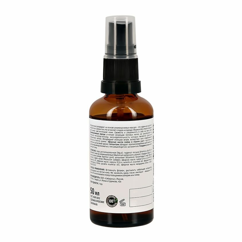 Состав: вода дистиллированная (aqua), гидролат полыни (artemisia absinthium leaf water), квасцы алюмокалиевые (aluminium potassium sulphate), глицерин (glycerin), ксантановая камедь (xanthan gum), аллантоин (allantoin), бензиловый спирт (benzyl alcohol), сорбат калия (potassium sorbate), эфирное масло лайма (citrus aurantiifolia essential oil), эфирное масло нероли (citrus aurantium essential oil), эфирное масло грейпфрута (citrus paradisi essential oil), эфирное масло мандарина (citrus nobilis essential oil)