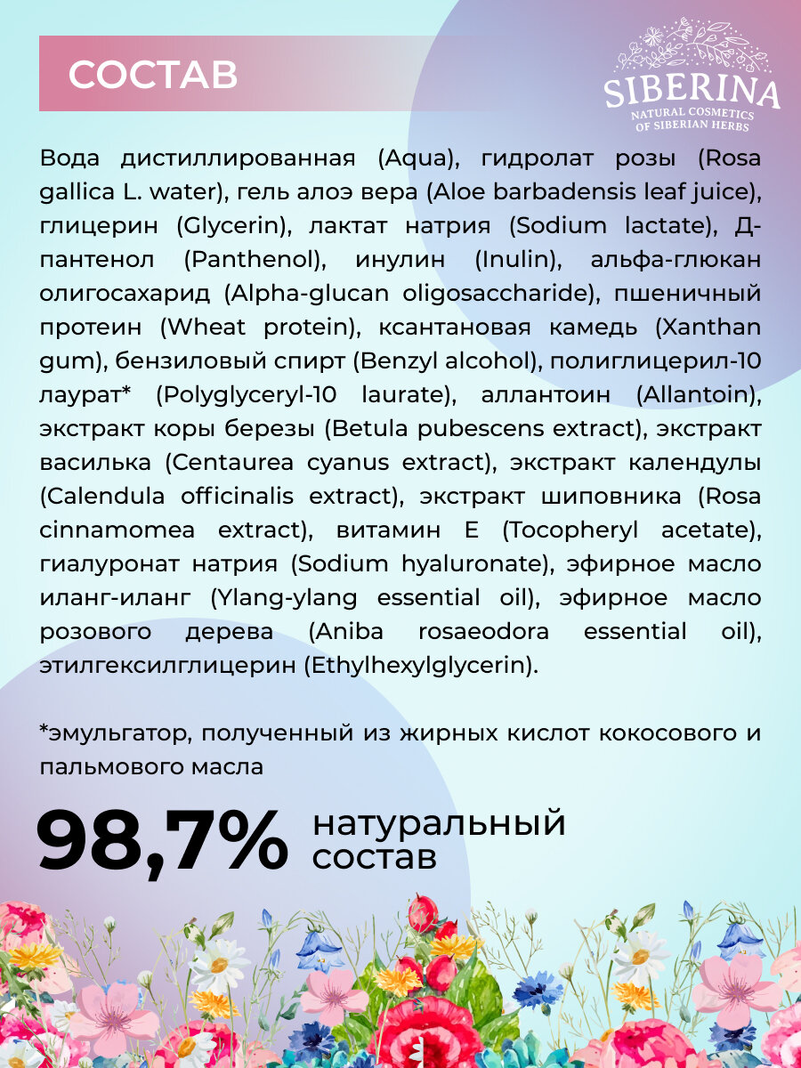 | Состав | вода дистиллированная (Aqua), гидролат розы (Rosa gallica L. water), гель алоэ-вера (Aloe barbadensis leaf juice), глицерин (Glycerin), Д-пантенол (Panthenol), лактат натрия (Sodium lactate), инулин (Inulin), пшеничный протеин (Wheat protein), ксантановая камедь (Xanthan gum), бензиловый спирт (Benzyl alcohol), аллантоин (Allantoin), экстракт коры березы (Betula pubescens extract), экстракт василька (Сеntaurea cyanus extract), экстракт календулы (Calendula officinalis extract), экстракт шиповника (Rosa cinnamomea extract), витамин Е (Tocopherol), гиалуроновая кислота (Sodium hyaluronate), эфирное масло иланг-иланг (Ylang-ylang essential oil), эфирное масло розового дерева (Aniba rosaeodora essential oil), этилгексилглицерин (Ethylhexylglycerin). |