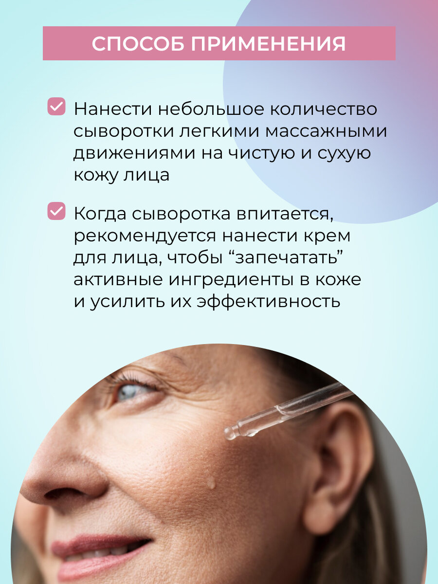 | Способ применения | Нанести небольшое количество сыворотки легкими массажными движениями на чистую и сухую кожу лица до использования крема. Можно использовать разово, курсами и постоянно. |