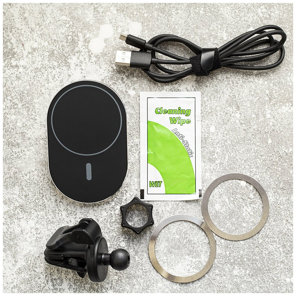 Автомобильный держатель Olmio Magnet Safe QI предназначен для совместного использования со всеми устройствами, в которых реализована поддержка технологии беспроводной зарядки MagSafe. Фиксация устройства на держателе осуществляется при помощи магнитного кольца, которое располагается на задней стороне смартфона. Интеллектуальный держатель оптимизирует необходимые параметры подачи питания в зависимости от характеристик устройства. Конструкция крепления с вращением на 360 градусов повышает комфорт в использовании Olmio Magnet Safe QI. В комплекте поставляются 2 металлических кольца, влажная салфетка и кабель питания с разъемом стандарта USB Type-C.