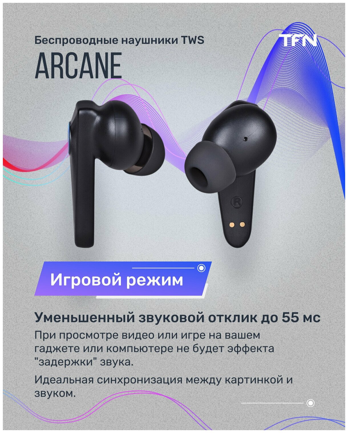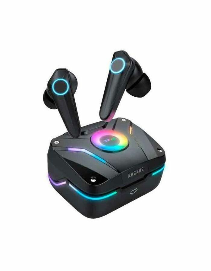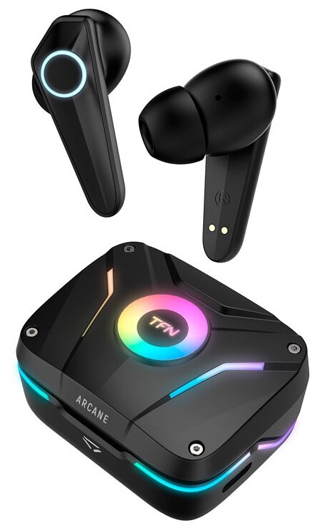 Игровая гарнитура Arcane True Wireless это яркое оружие в мире кибер-сражений. Стильная светодиодная подсветка кейса имеет несколько режимов. Удобная эргономика наушника и низкая звуковая задержка 55 мс.