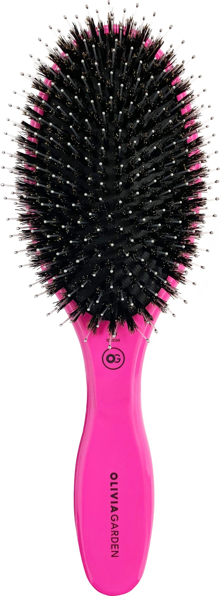 Данная модель оснащена комбинированной щетиной из нейлонового материала и натуральной щетины дикого кабана. Резиновый амортизатор щетины способствует деликатному воздействию на волосы и кожу головы и эффективной укладке. Дополнительный уход за волосами обеспечивается благодаря поверхности, которая при нагревании генерирует отрицательно заряженные частицы–ионы, взаимодействующие с волосами и влияющие на структуру волосяного стержня, способствуя сглаживаю его чешуек и обеспечению мягкости и увлажненности волос, устранению статического электричества.