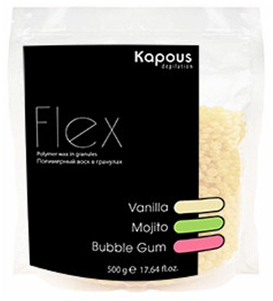 Полимерный воск в гранулах Flex на синтетической основе Kapous. Новейшая формула для депиляции всего тела, лица, чувствительных участков кожи и интимных зон. Эластичная структура полимерного воска и низкая рабочая температура позволяют быстро и качественно удалять любые нежелательные волосы от 1 - 2 мм. Благодаря входящим в состав полимерам и маслам воск повторяет форму депилируемой зоны при нанесении, не травмирует кожу, снижает болевые ощущения, обладает мгновенным эффектом пиллинга. Нежная текстура воска легко наносится на кожу в независимости от роста волос. Меры предосторожности: перед применением проконсультируйтесь со специалистом. Не наносить на поврежденные участки кожи (раны, ссадины, ожоги).
