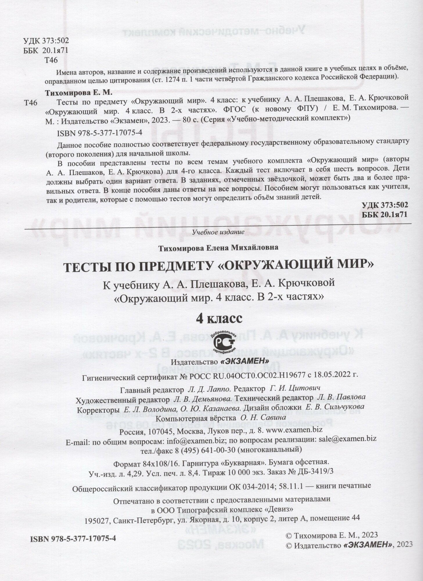 Окружающий мир. 4 класс. Тесты к учебнику А. А. Плешакова Е. А. Крючковой. (Тихомирова Елена Михайловна); Экзамен, 2024