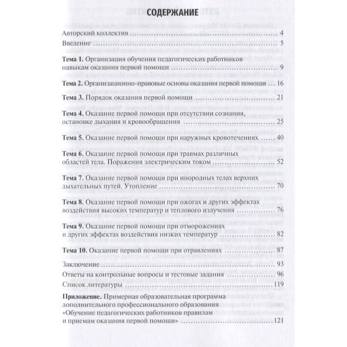 Обучение педагогических работников правилам и навыкам оказания первой помощи является обязательным требованием для получения организацией лицензии на образовательную деятельность. В учебном пособии рассмотрены вопросы оказания своевременной помощи людям, пострадавшим в результате чрезвычайных происшествий, особенно если речь идет об обучающихся (детях, подростках, молодежи). Издание содержит иллюстративный материал, тестовые и ситуационные задачи и учебную программу, рассчитанную на 16 учебных часов.