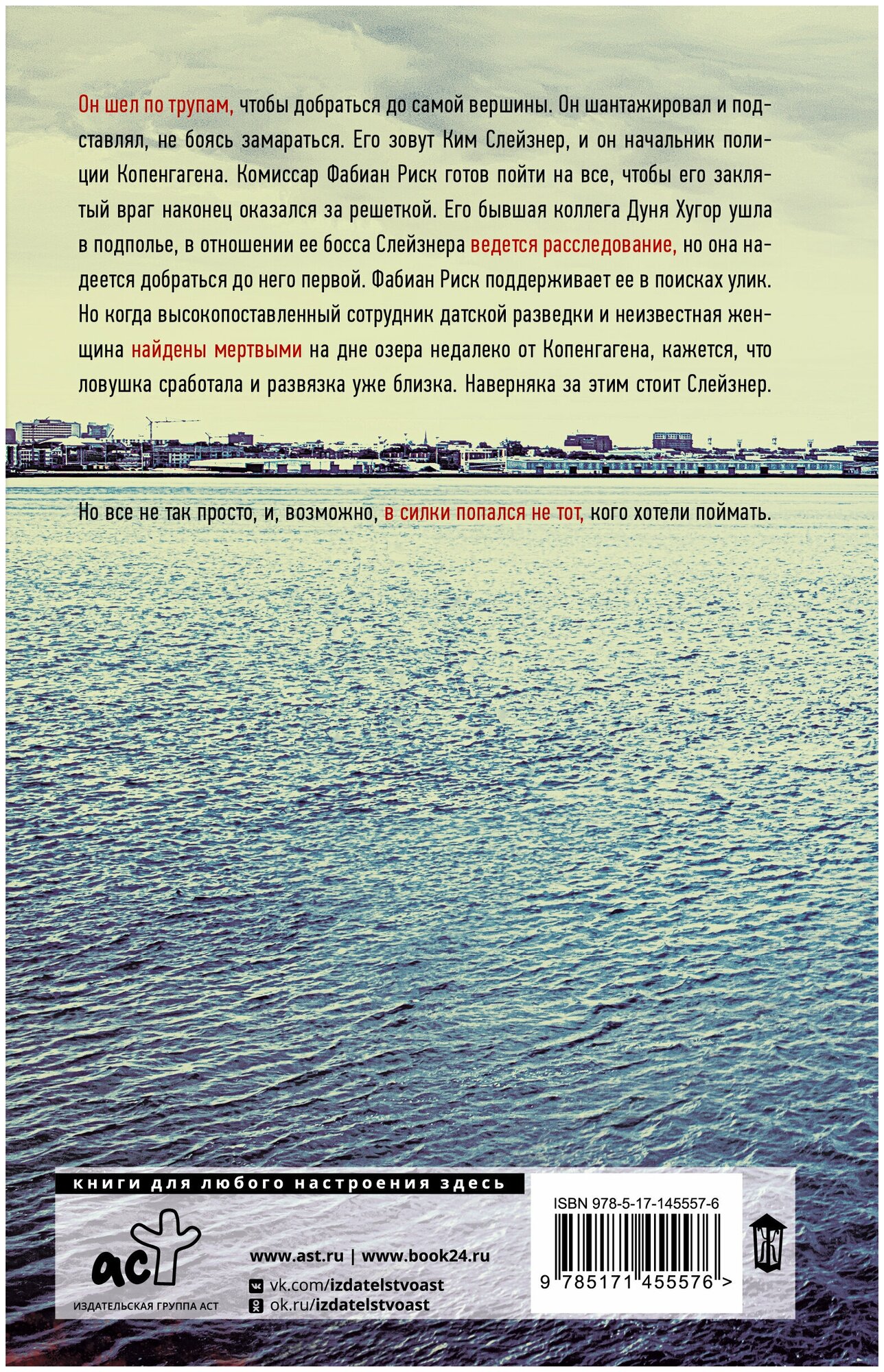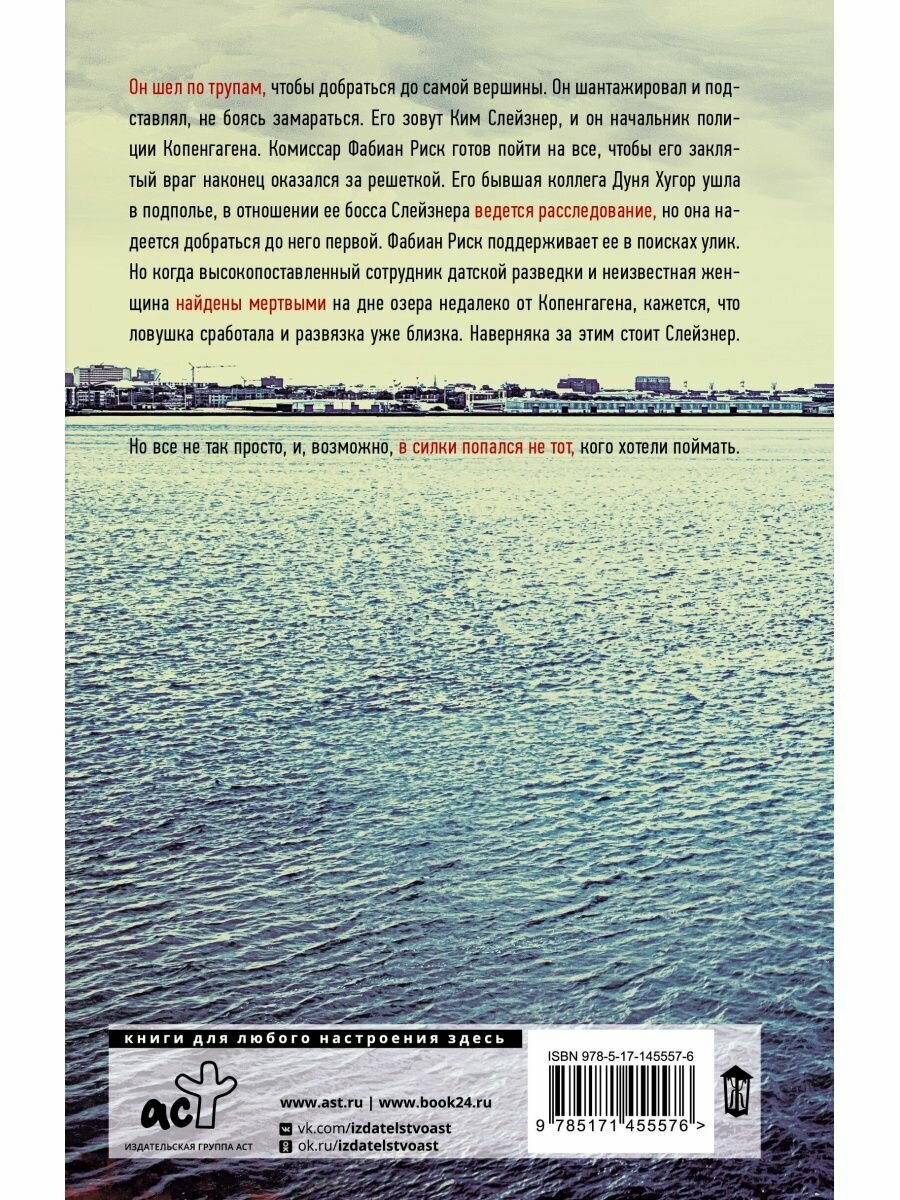 Он шел по трупам, чтобы добраться до самой вершины. Он шантажировал и подставлял, не боясь замараться. Его зовут Ким Слейзнер, и он начальник полиции Копенгагена. Комиссар Фабиан Риск готов пойти на все, чтобы его заклятый враг наконец оказался за решеткой. Его бывшая коллега Дуня Хугор ушла в подполье, в отношении ее бывшего босса Слейзнера ведется расследование, но она надеется добраться до него первой. Фабиан Риск поддерживает ее в поисках улик. Но когда высокопоставленный сотрудник датской разведки и неизвестная женщина найдены мертвыми на дне озера недалеко от Копенгагена, кажется, что ловушка сработала и развязка уже близка. Наверняка за этим стоит Слейзнер.