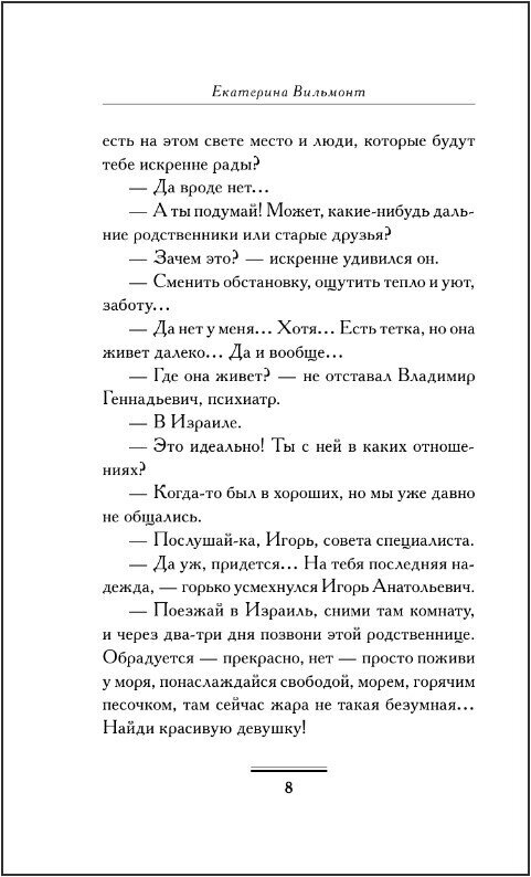 Замечательный роман - лиричный, добрый, проникновенный. В стиле Екатерины Вильмонт. Как здорово погрузиться в неповторимую атмосферу тонкого юмора, сопереживать героям, радоваться и печалиться вместе с ними. Знать, что, несмотря на сложности и испытания, все будет хорошо. Много лет произведения Екатерины Вильмонт находили неизменный отклик в моей душе. Мы были "на одной волне". Каждая книга - большая радость. Как жаль, что это последний роман автора.