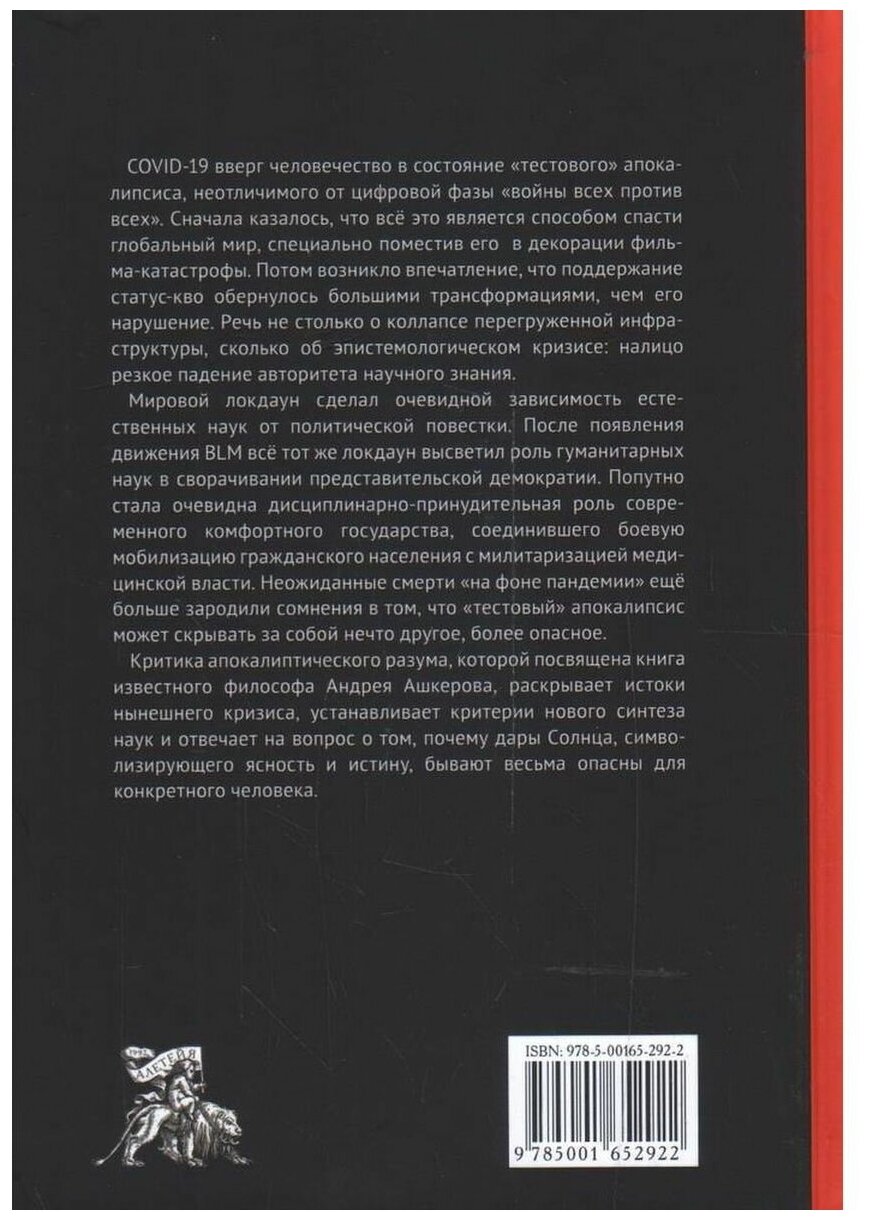 Критика апокалиптического разума, которой посвящена книга известного философа Андрея Ашкерова, раскрывает истоки нынешнего кризиса, устанавливает критерии нового синтеза наук и отвечает на вопрос о том, почему дары Солнца, символизирующего ясность и истину, бывают весьма опасны для конкретного человека.