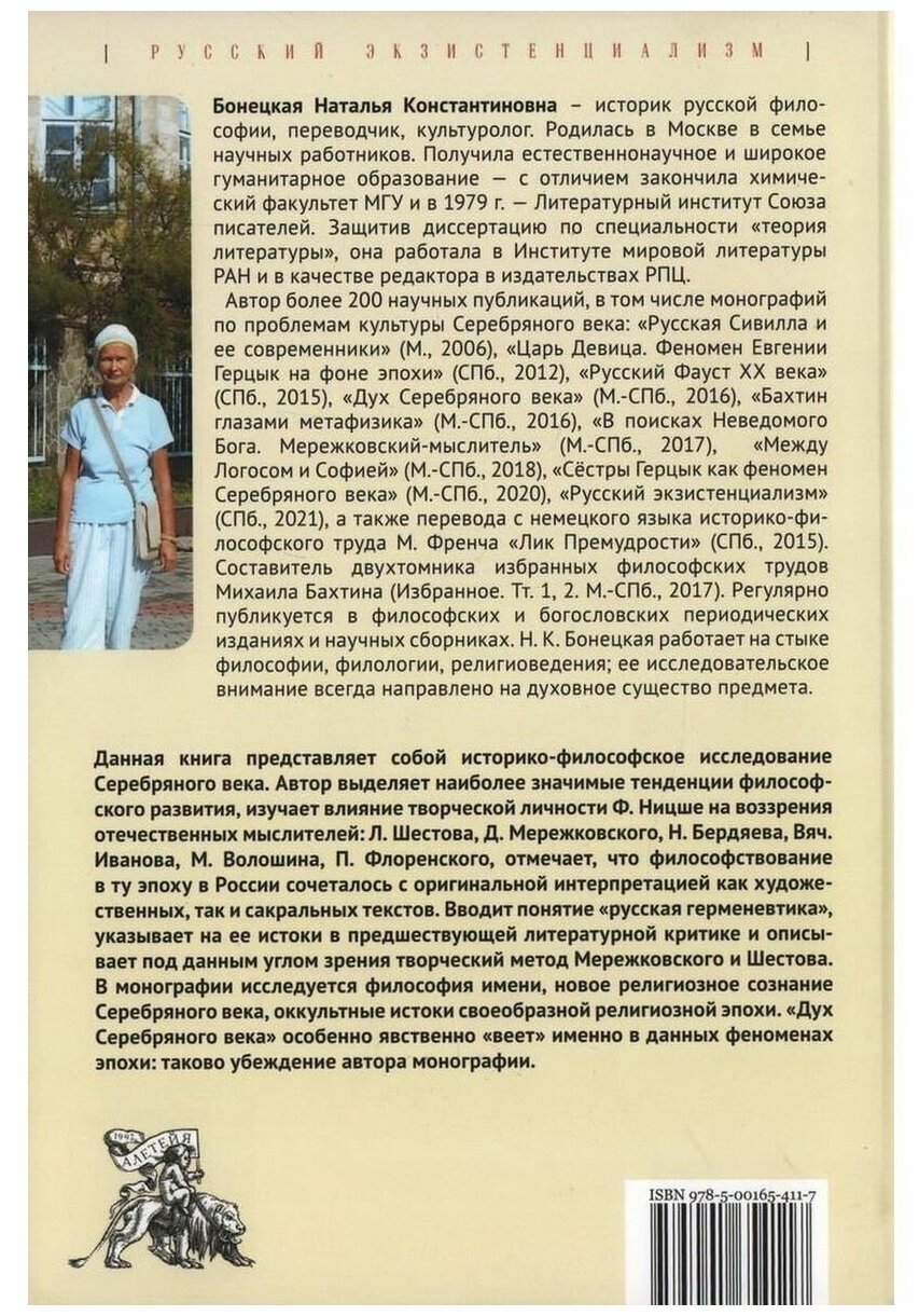 Н. К. Бонецкая — автор двух монографий и многочисленных статей по проблемам русской мысли, истории русской философии конца XIX — первых десятилетий XX века. Она вводит понятие "русская герменевтика", указывает на ее истоки в предшествующей литературной критике и описывает под данным углом зрения творческий метод Мережковского и Шестова. В монографии исследуется философия имени, новое религиозное сознание Серебряного века, оккультные истоки своеобразной религиозной эпохи. "Дух Серебряного века" особенно явственно "веет" именно в данных феноменах эпохи: таково убеждение автора монографии, рисующего феноменологическую картину Серебренного века.