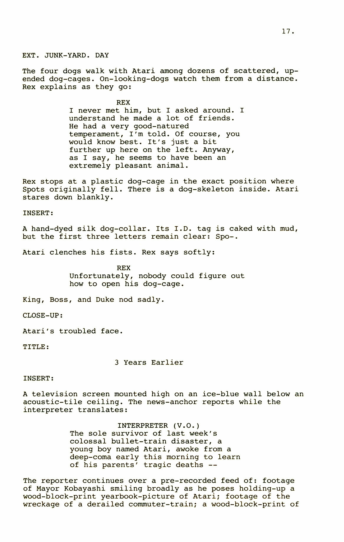Wes Anderson startled audiences with his stop-motion animated film of Roald Dahl`s Fantastic Mr Fox.He now displays his unique wit and playful visual sense in an action-filled saga of Samurai dogs.