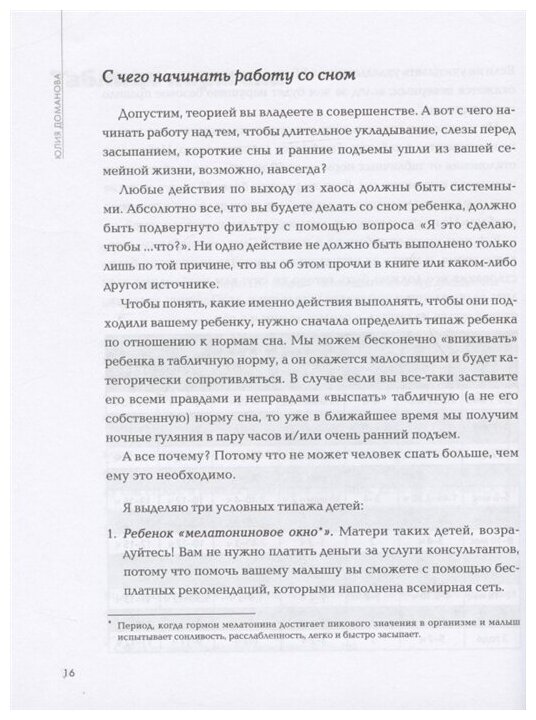 В книге много интересной для взрослых читателей информации. Довольно-таки понятная классификация детей по тому, как они спят. Все систематизировано и объяснено, даны практические советы. Вся книга пропитана мыслью, что все будет хорошо, не надо переживать и волноваться, а бессонные ночи родителей скоро закончатся. Даже если ребенок не спит это нормально. Все так и есть, с этим не поспоришь. Вот только эта книга нужна скорее маме, чтобы успокоиться. И это тоже важно. Потому что если спокойна мама, спокоен ребенок, и сразу спать легче.