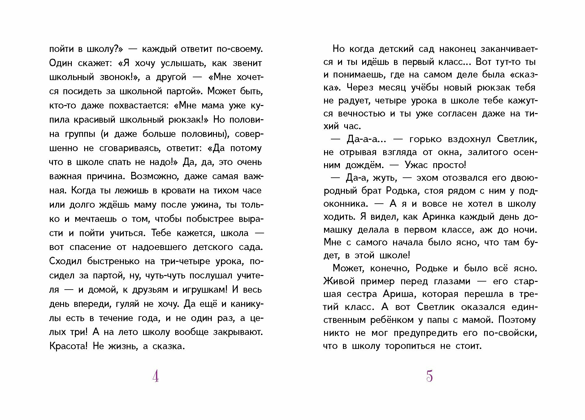 А начинаются приключения 7-летнего мальчишки в первом классе, где ему совсем не нравится. Закорючки-прописи, скучные примеры, обязательное чтение - в детском саду ничего такого не было, только знай себе играй! "Вот бы вернуться в то счастливое время", - думает однажды Светлик, и вместе с двоюродным братом Родькой придумывает, казалось бы, идеальный план.