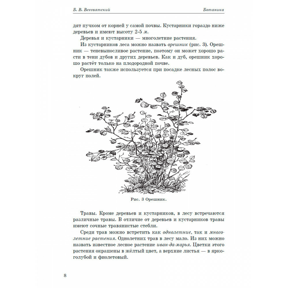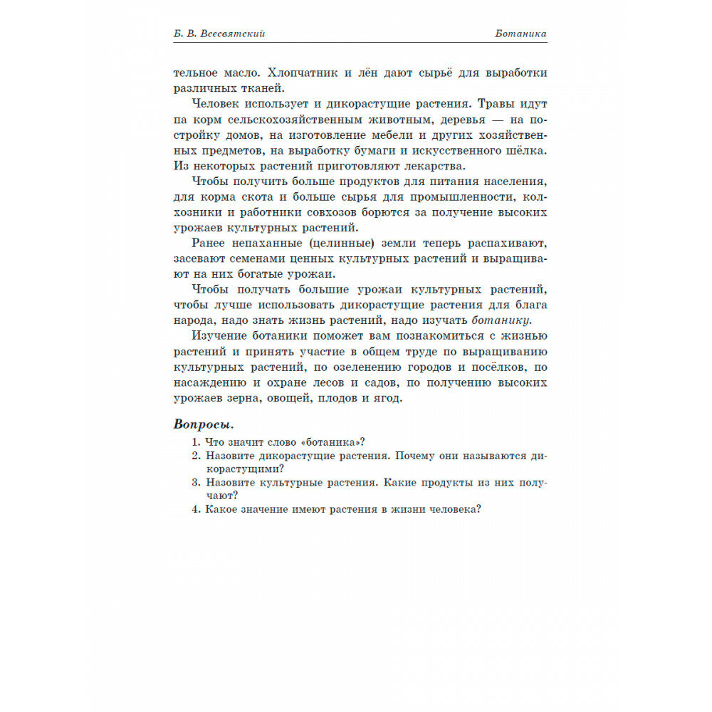 Ботаника - наука о растениях, которая изучает их происхождение, развитие, внешнее и внутреннее строение, классификацию, распространение по земной поверхности, а также охрану и экологию. Знание ботаники необходимо, так как при правильном применении растения могут приносить огромную пользу в различных сферах человеческой жизнедеятельности. Настоящее издание представляет собой оригинальный текст, выпущенный в 1957 году. Учебник составлен известным советским педагогом, методистом-биологом, профессором Борисом Всесвятским, который одним из первых разработал школьные программы по биологии. Пособие содержит подробные сведения о дикорастущих и культурных растениях, а также интересные опыты и примеры, помогающие лучше усвоить пройденный материал.