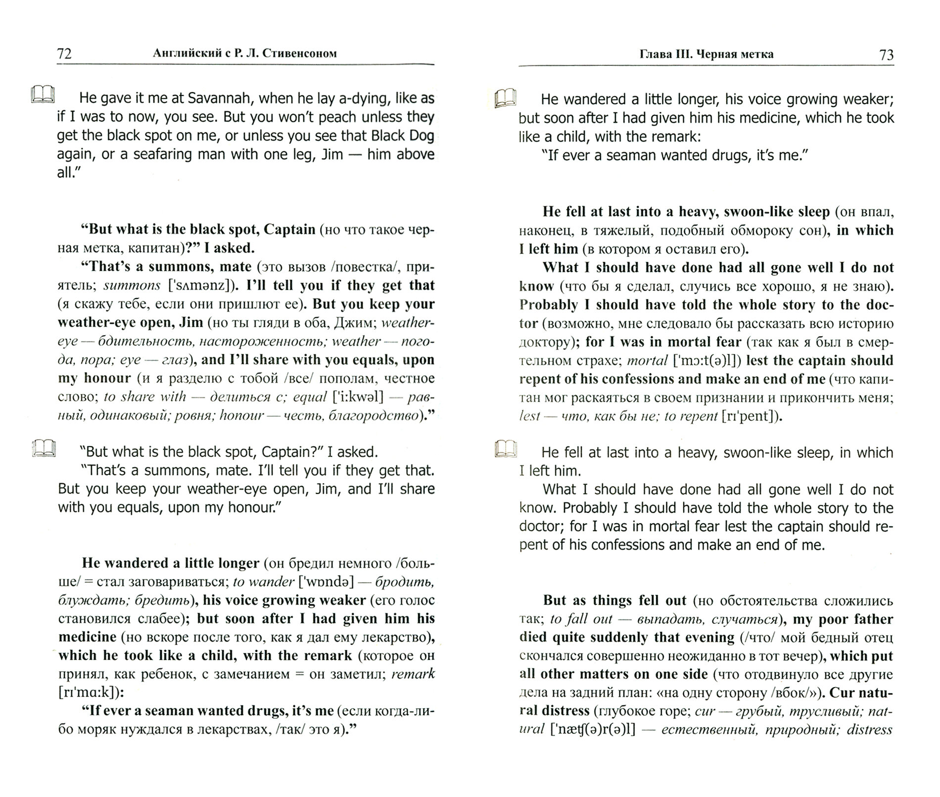 Свою задачу, как пособие для чтения на английском языке, книга выполняет на 100%. Читать знаменитое произведение Стивенсона в оригинале, даже учитывая, что сюжет знаком с детства, мне было тяжело. В оригинальном тексте отражены особенности речи персонажей, очень много морских терминов, устаревших слов и сленга. Поэтому Андрей Еремин дает не только дословный перевод, но и краткое пояснение сложных моментов текста. С таким пособие легко погружаешься и в атмосферу сюжета и в изучаемый язык.