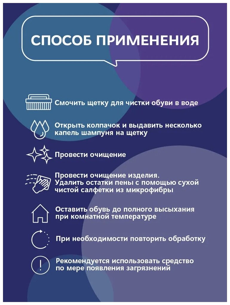 Концентрированное средство для очищения обуви. Позволяет избавиться от сложных загрязнений различного происхождения (пятна, подтеки, разводы и т. п.). Помогает продлить срок службы и сохранить внешний вид изделия. Подходит для всех типов обуви (классическая, спортивная и т.д.) и для ежедневного использования. Также подойдет для ухода за одеждой, аксессуарами, мебелью, текстильными изделиями и синтетическими материалами.