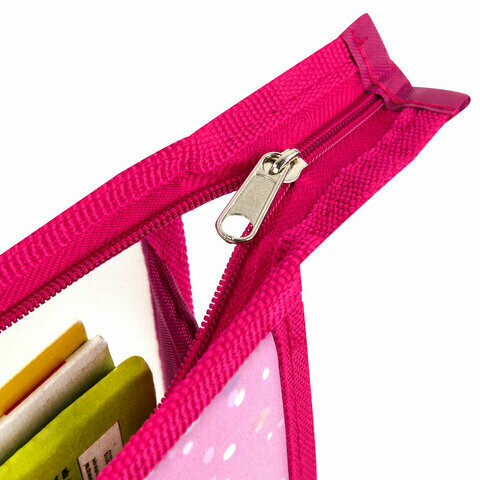 Папка для тетрадей формата А4 выполнена из пластика, по краям имеет тканевую окантовку. Одно отделение. Застежка-молния расположена по верхнему краю папки. Цветная печать.