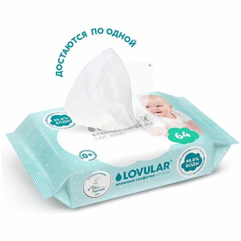 Гипоаллергенные влажные салфетки для детей Lovular 0+ созданы с любовью и заботой! Состоят на 99,8% из сверх очищенной воды и на 0,2% из увлажняющих и антибактериальных ингредиентов. При разработке косметических салфеток, мы использовали новейшую технологию HOT WIND. Полотно обработано сверхгорячим паром, которое создает состояние близкое к стерильности. Благодаря такой обработке, салфеточки становятся мягкими и нежными, как мамины ручки! Без микробов, грибков и бактерий.Размер салфетки 21 на 15 сантиметров. Прекрасно впитывают загрязнения. В большинстве случаев, достаточно одной штучки, чтобы кожа грудничка вновь стала чистой. В пачке 64 штуки. Удобный клапан на липучке герметичен, предотвращает высыхание. Влажные тряпочки изготовлены из высококачественных материалов, не содержат в составе спирт, парабены, ароматизаторы, отдушки, запахи, красители, остатки продуктов отбеливания и нефтепереработки. Дерматологически протестированы в лаборатории производителя. Не оставляют следов липкости и пятен на чувствительной коже младенца. Не вызывают раздражения, воспаления и красноты. Успокаивает кожу малыша. Поддерживают уровень PH в норме. Не оставляют ворсинок на лице и теле ребёнка. Мягкие, плотные, экологически чистые. Прочные, не растягивается в нитку. Незаменимы при смене подгузника в условиях отсутствия мыла и воды. Удобно взять с собой на прогулку, в коляску, в дальнюю поездку на автомобиле, поезде или автобусе, в самолёт. Влажные салфетки одна из самых необходимых вещей для сумки в роддом и для похода в больницу на прием к педиатру. Полотенцами можно обрабатывать грудь кормящей матери перед грудным вскармливанием, снимать макияж и косметику, протирать пыль на пеленальном столике в детской комнате. Смывать следы масел и крема после массажа. Используйте их вместо туалетной бумаги для всей семьи, интимной гигиены после родов. Подходит для дезинфекции игрушек, погремушек, грызунков, сосок и прочих детских принадлежностей. Компактная пачка поместится в любую сумочку и впишется в интерьер детской или ванной комнаты. Наша косметика для новорожденных разработана для удобного и комфортного пользования мамы, папы и беременных женщин. Натуральные материалы и современные технологии гарантируют абсолютную безопасность использования салфеток. Нежная забота, которая всегда под рукой!