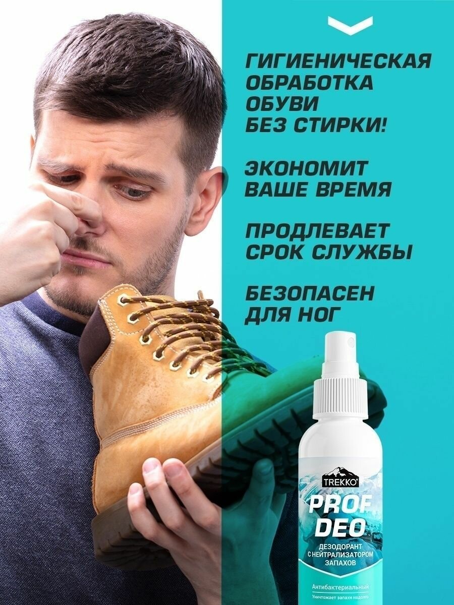 TREKKO PROF DEO — экстремально сильный нейтрализатор запахов с антибактериальным комплексом. Моментально и полностью удаляет, а не маскирует неприятный запах, предотвращает рост и развитие бактерий и грибков, сохраняет свежесть надолго, справляется даже со стойкими неприятными запахами. Рекомендован для обработки внутренней поверхности спортивной и повседневной обуви из любых материалов, в том числе спортивных и походных ботинок, кроссовок и коньков. Не оставляет следов, образует тонкую защитную пленку, предотвращающую рост бактерий.