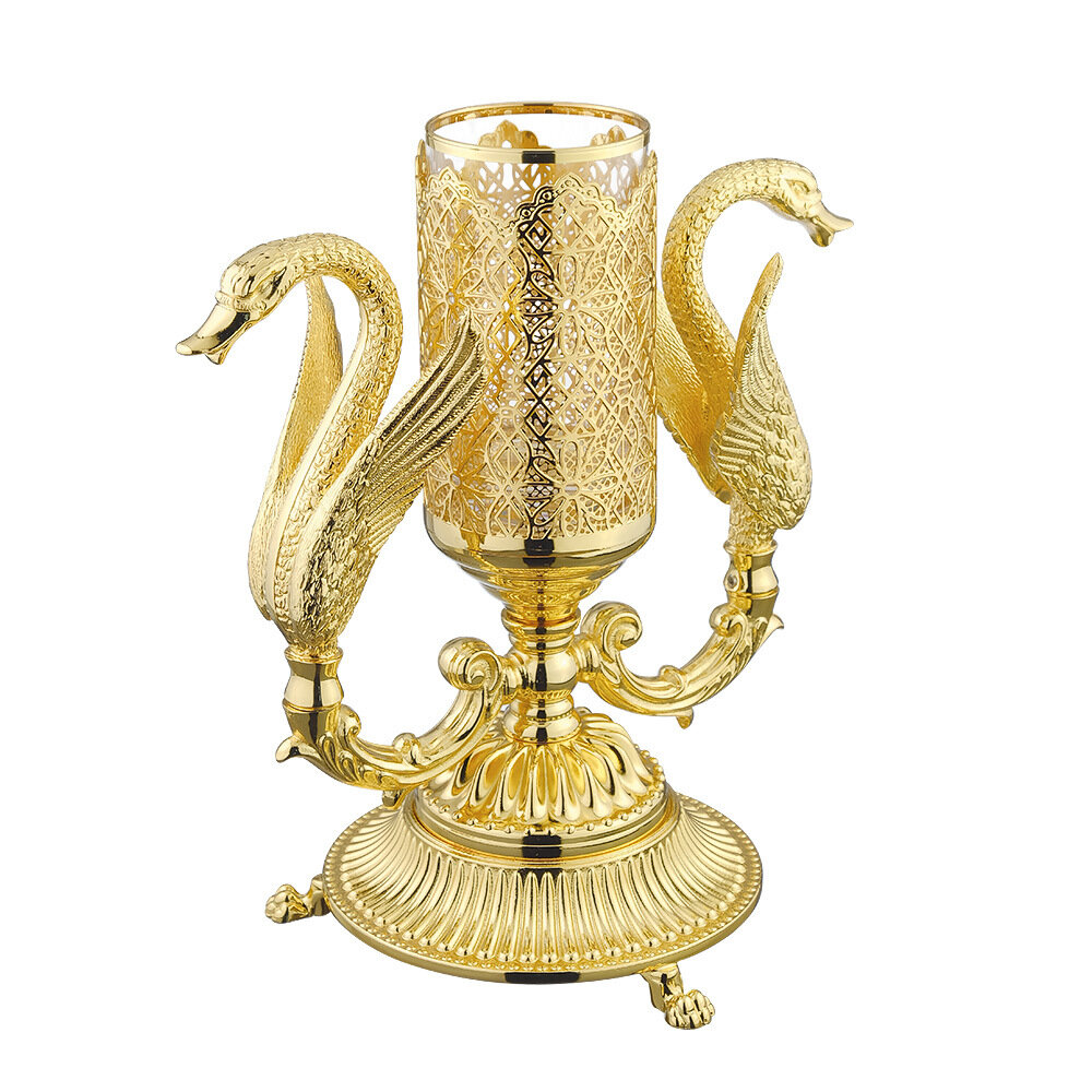Настольный стакан коллекции LUXOR бренда MIGLIORE предназначен для хранения зубных щеток и тюбиков с пастой. Также удобен для хранения бритвенного станка или кистей для макияжа. Внешнее ажурное обрамление из латуни, внутри — стеклянный стакан, декорированный золотой полосой 24 кт. Два лебедя по бокам стакана придают ему особо роскошный вид. Изделие выполнено из высококачественной латуни и имеет гальваническое покрытие золотом 24 карата. Внимание: золотое покрытие очень деликатное и для ухода рекомендуется использовать чистящее средство бренда MIGLIORE для смесителей и аксессуаров с деликатными покрытиями бронза, золото, медь и протирать мягкой ветошью. Внимание: золотое покрытие очень деликатное и для ухода рекомендуется использовать чистящее средство бренда MIGLIORE для смесителей и аксессуаров с деликатными покрытиями бронза, золото, медь и протирать мягкой ветошью. Материал: Латунь+стекло Оснащение: крепления (шурупы)
