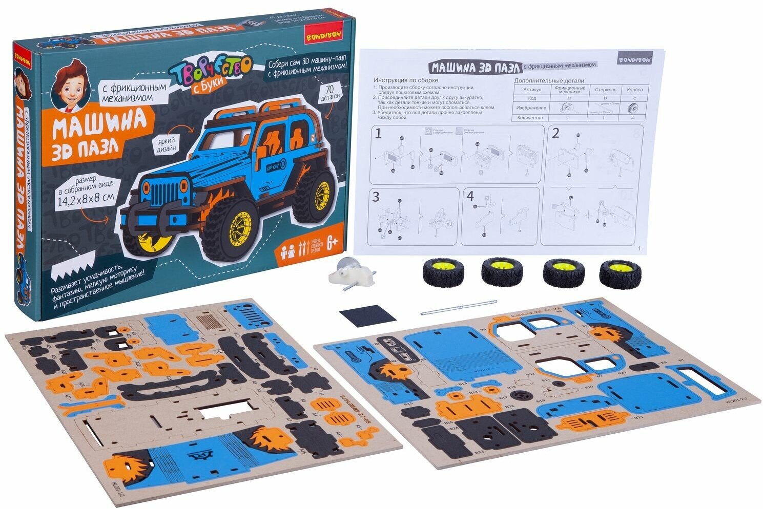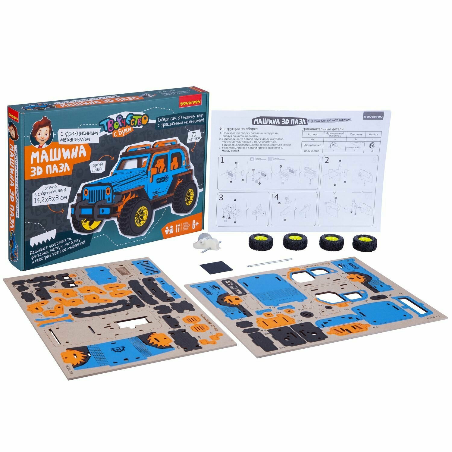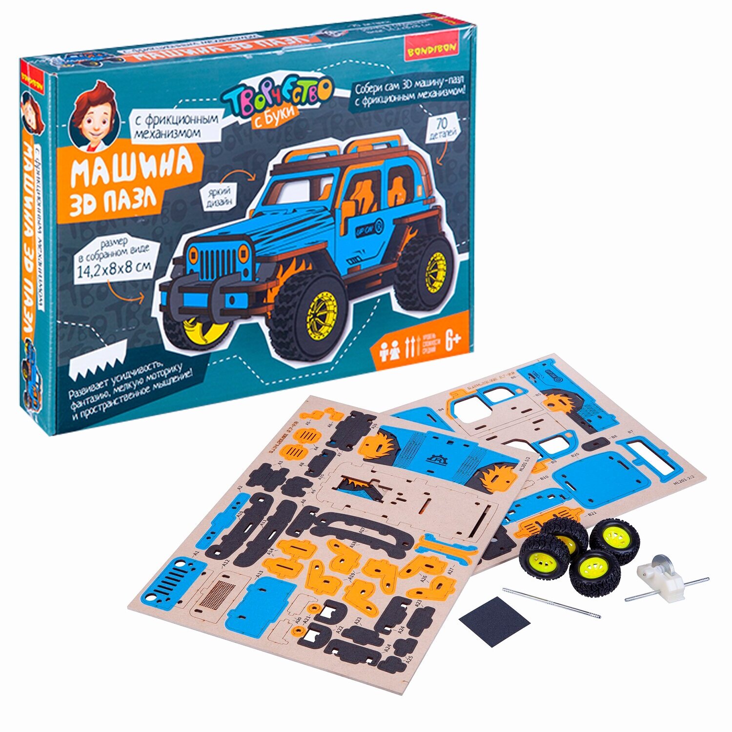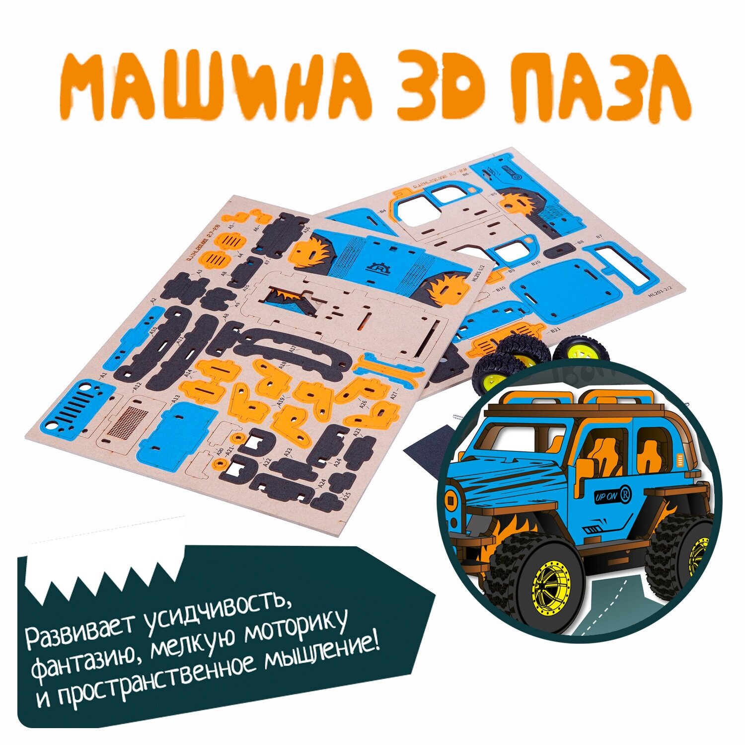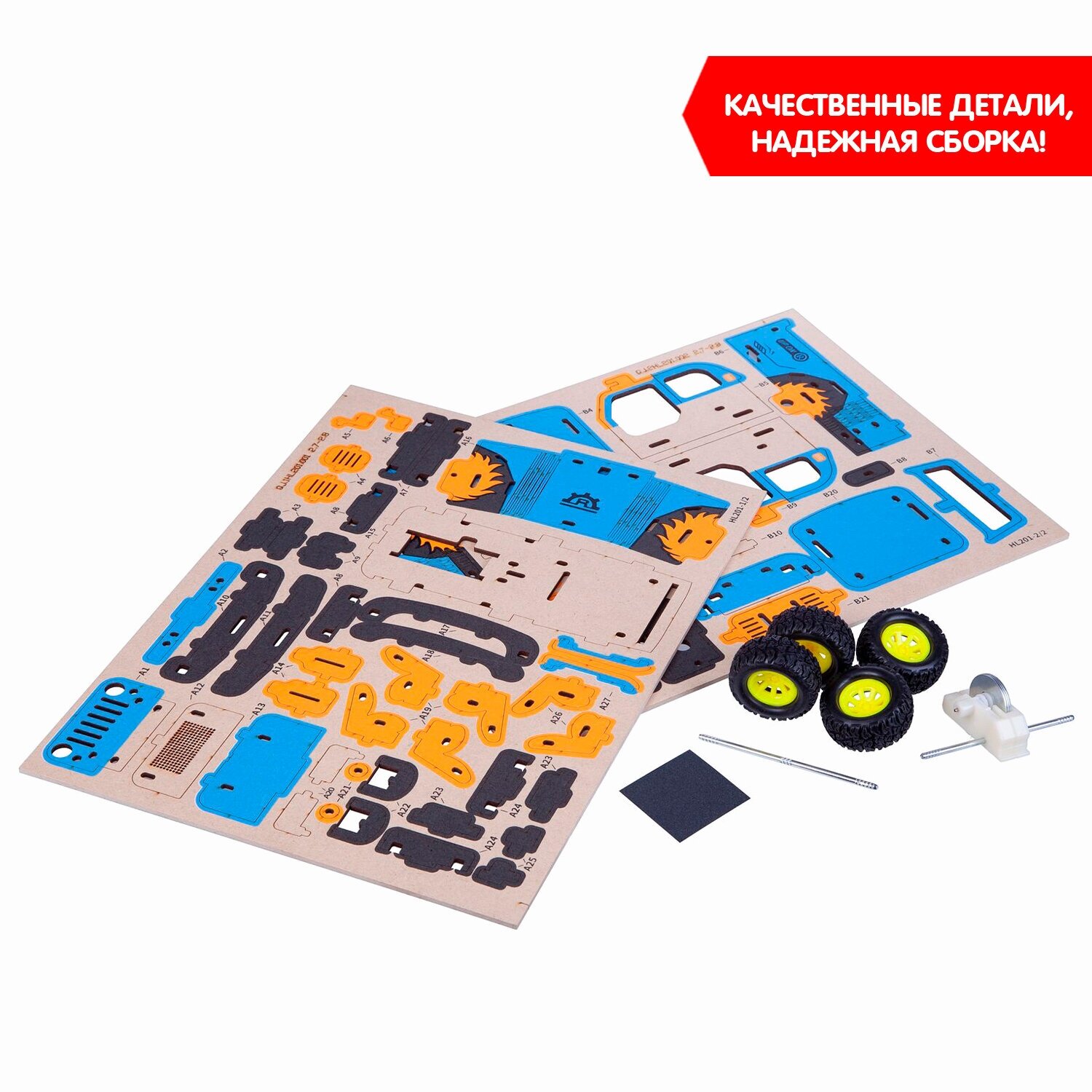 С помощью яркого и оригинального 3D-пазла ребенок сможет самостоятельно собрать внедорожник с фрикционным механизмом, который позволит машинке при создании определенной силы трения-скольжения, быстро ездить вперед.