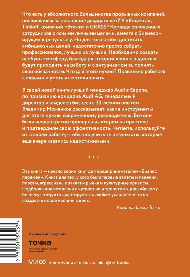Автор многочисленных бестселлеров и опытный менеджер Владимир Моженков в этой книге обращается к проблеме мотивации сотрудников. Он рассматривает основные способы вдохновить коллег, делится работающими инструментами и интересными примерами из своего опыта.