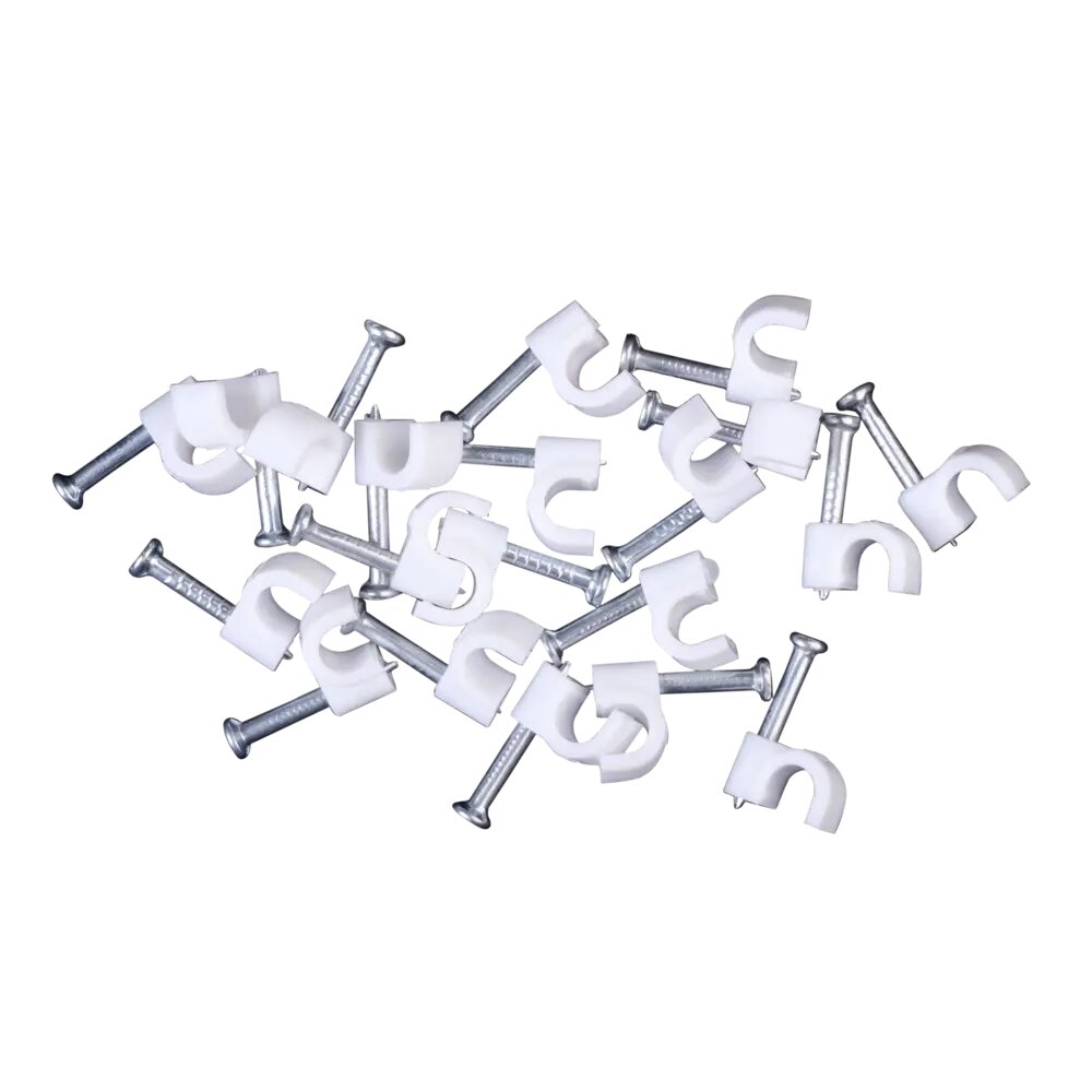 Высококачественный круглый крепеж кабеля представляет собой дугообразную пластиковую скобу диаметром от 4 до 9 мм с гвоздём. Используется для мгновенного, а главное надёжного крепления проводов и кабелей к поверхностям стен, несущих конструкций и потолков. Гвоздик выполнен из закаленного металла, что позволит надежно забивать его даже в плотные и твердые материалы, не опасаясь сломать или погнуть гвоздь.