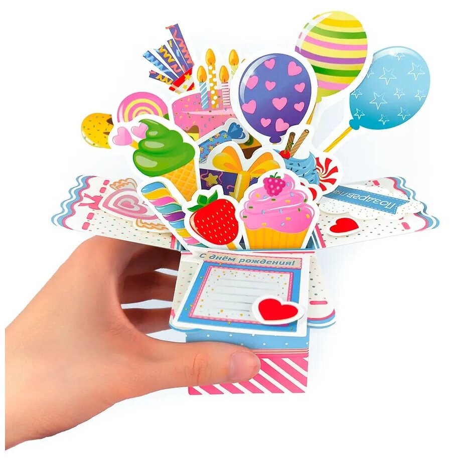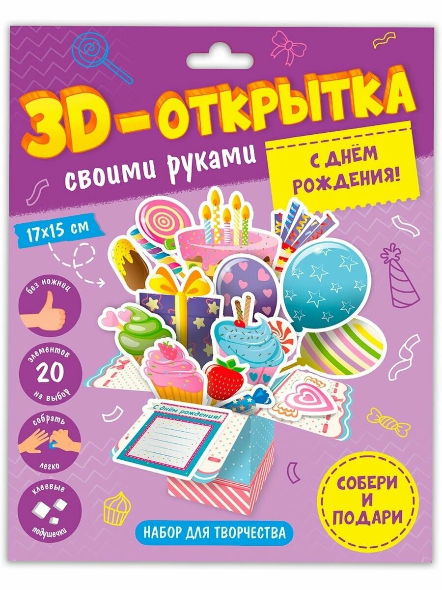 Креативный подарок на день рождения – своими руками! В этом наборе для творчества есть всё, что нужно, чтобы сделать необычную 3D-открытку без помощи ножниц: основа для открытки-коробочки, 20 ярких элементов на выбор,