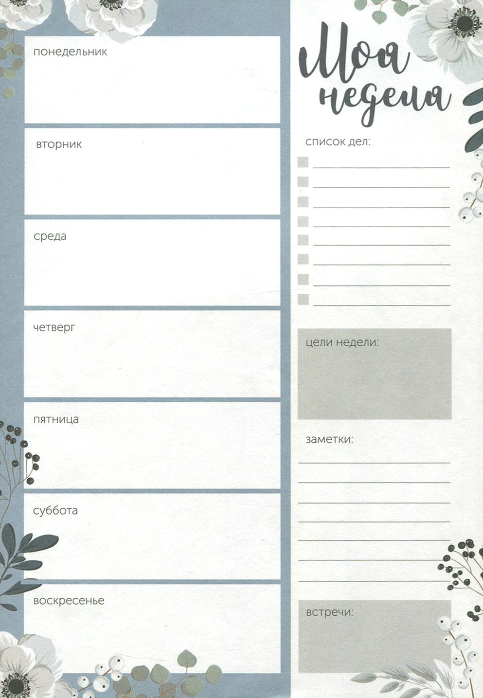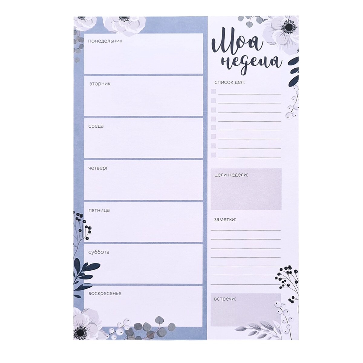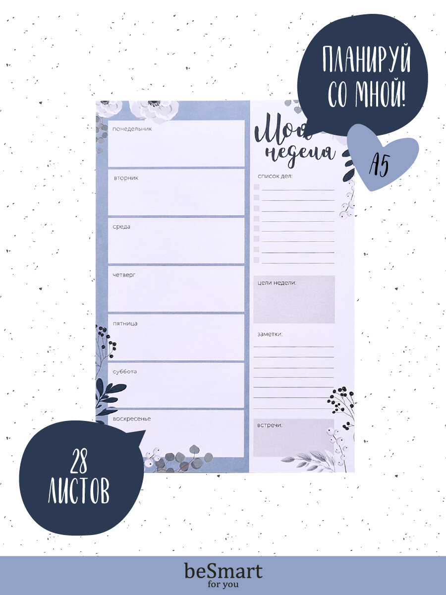 Дизайнерский недатированный планнер Be Smart из коллекции "Anemona" на клеевом скреплении А5 формата (145х210 мм) с загадочным и романтичным цветочным дизайном.Блок со специальной линовкой на одну неделю на 28 листов - из высококачественной белой бумаги плотностью 80 г/м2 с цветной печатью с одной стороны.
