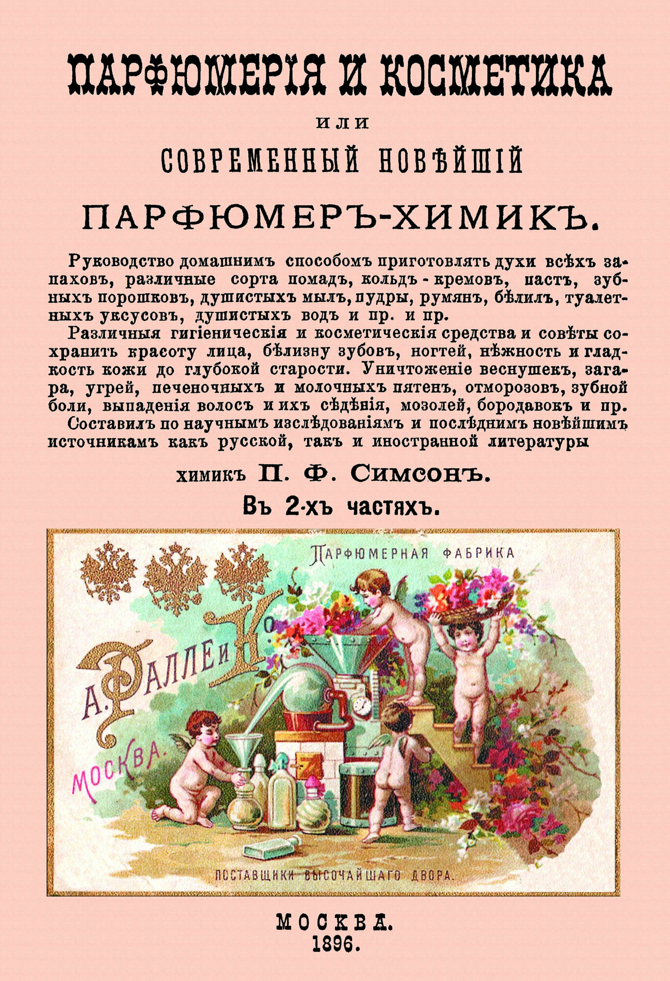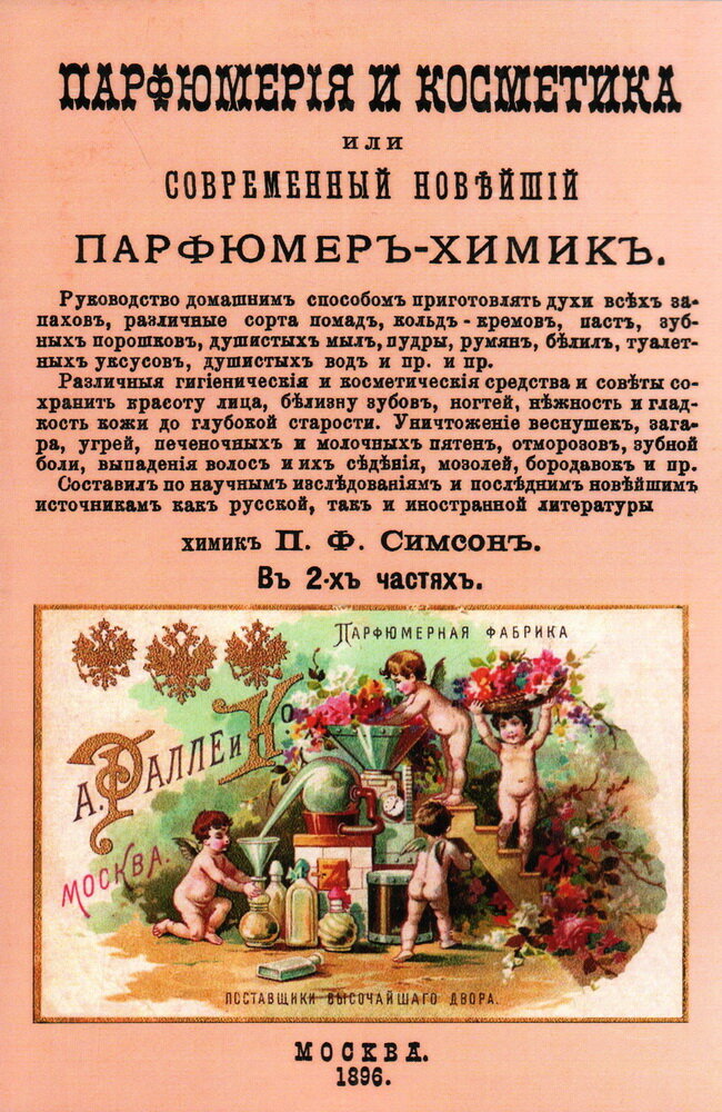 Репринт с издания. Москва, Г. Т. Бриллиантов, 1896. Второе название - Новейшая и полная парфюмерия высшего качества. Руководство домашним способом приготовлять духи всех запахов, различные сорта помад, кольд-кремов, паст, зубных порошков, душистых мал, пудры, румян, белил, туалетных уксусов, душистых вод и пр., и пр. Различные гигиенические и косметические средства и советы сохранить красоту лица, белизну зубов, ногтей, нежность и гладкость кожи до глубокой старости. Уничтожение веснушек, загара, угрей, печеночных и молочных пятен, отморозов, зубной боли, выпадения волос и их сведения, мозолей, бородавок и пр. Составил по научным исследованиям и последним новейшим источникам как русской так и иностранной литературы химик П. Ф. Симсон. в 2-х частях. Это рецепты продукции лучших зарубежных производителей начала XX века: духов, туалетных и гигиенических мыл, разнообразных смесей для ухода за кожей и волосами. Он адаптировал промышленные способы изготовления косметики и парфюмерии для широкого круга читателей, сделав их доступными для реализации в домашних условиях. Особое внимание автор уделяет пахучим веществам, ингредиентам для парфюмерных составов: духов первого и второго сорта, туалетных вод, ароматических спиртов. Тираж 30 экз. выполнен по технологии print-on-demand.
