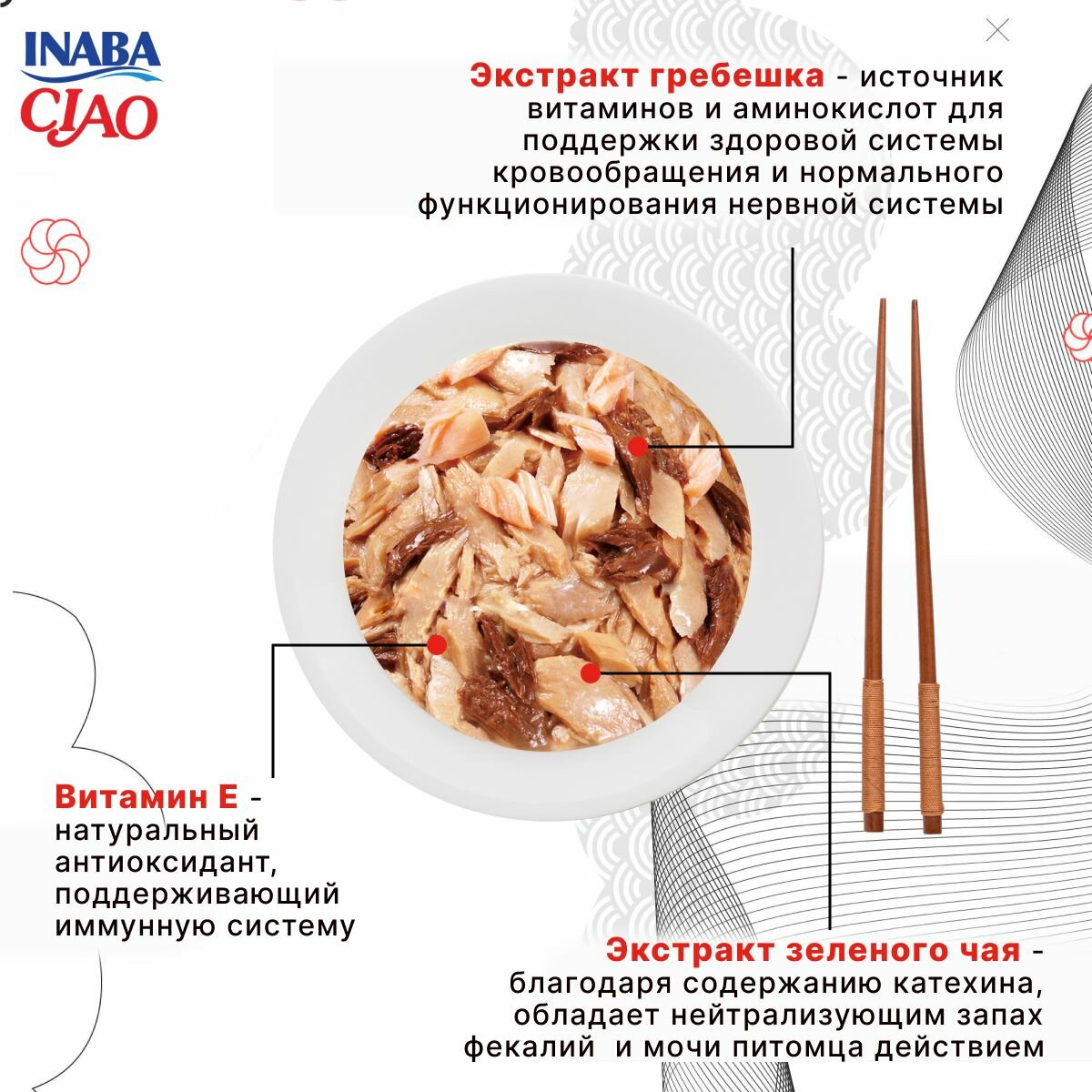 | Состав | Состав: тунец Кацуо, тунец Магуро, куриное филе, крахмал, экстракт тунца Кацуо, агар-агар, загуститель, экстракт зеленого чая, краситель (красный ферментированный рис) Аналитический состав: белки - 13%, жиры - 2,5%, клетчатка - 0,3%, зола - 0,8%, влажность- 83% Упаковка рассчитана на 1 кормление взрослой кошки среднего размера. Рекомендованная норма кормления до 2 упаковок в день как дополнение к полнорационному корму. Вскрытый пакетик хранить в холодильнике не более 24 часов. |