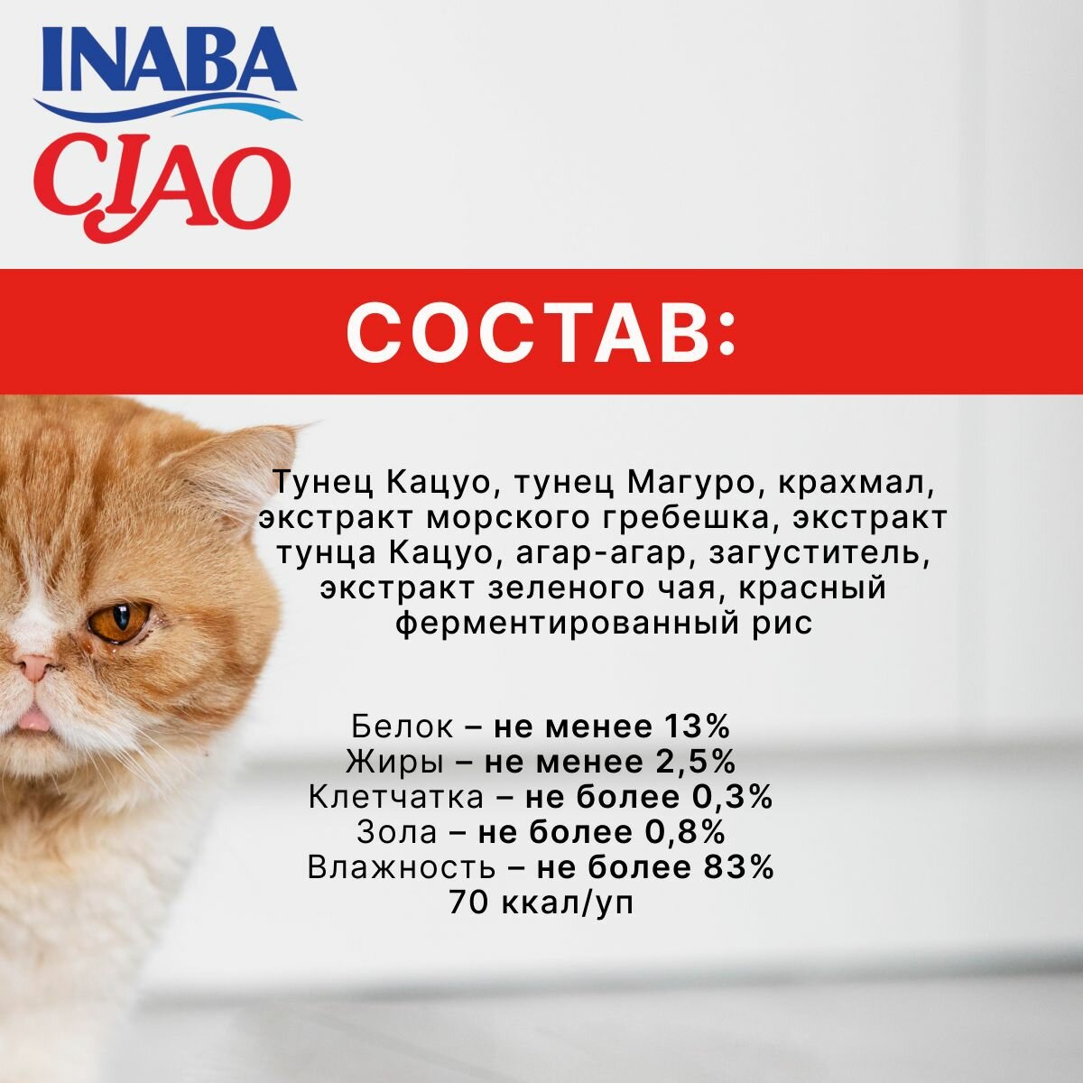 | Состав | Состав: тунец Кацуо, тунец Магуро, семга, крахмал, экстракт тунца Кацуо, агар-агар, загуститель, экстракт зеленого чая, краситель (красный ферментированный рис) Аналитический состав: белки - 13%, жиры - 2,5%, клетчатка - 0,3%, зола - 0,8%, влажность- 83% Упаковка рассчитана на 1 кормление взрослой кошки среднего размера. Рекомендованная норма кормления до 2 упаковок в день как дополнение к полнорационному корму. Вскрытый пакетик хранить в холодильнике не более 24 часов. |